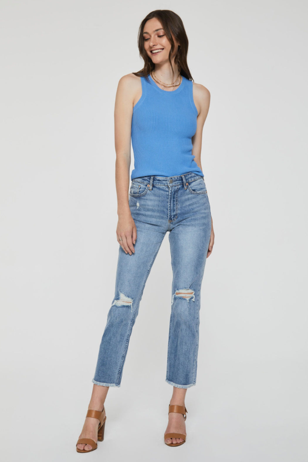 High neck, sleeveless rib top. Perfect to wear on its own or under other pieces for a layered look.