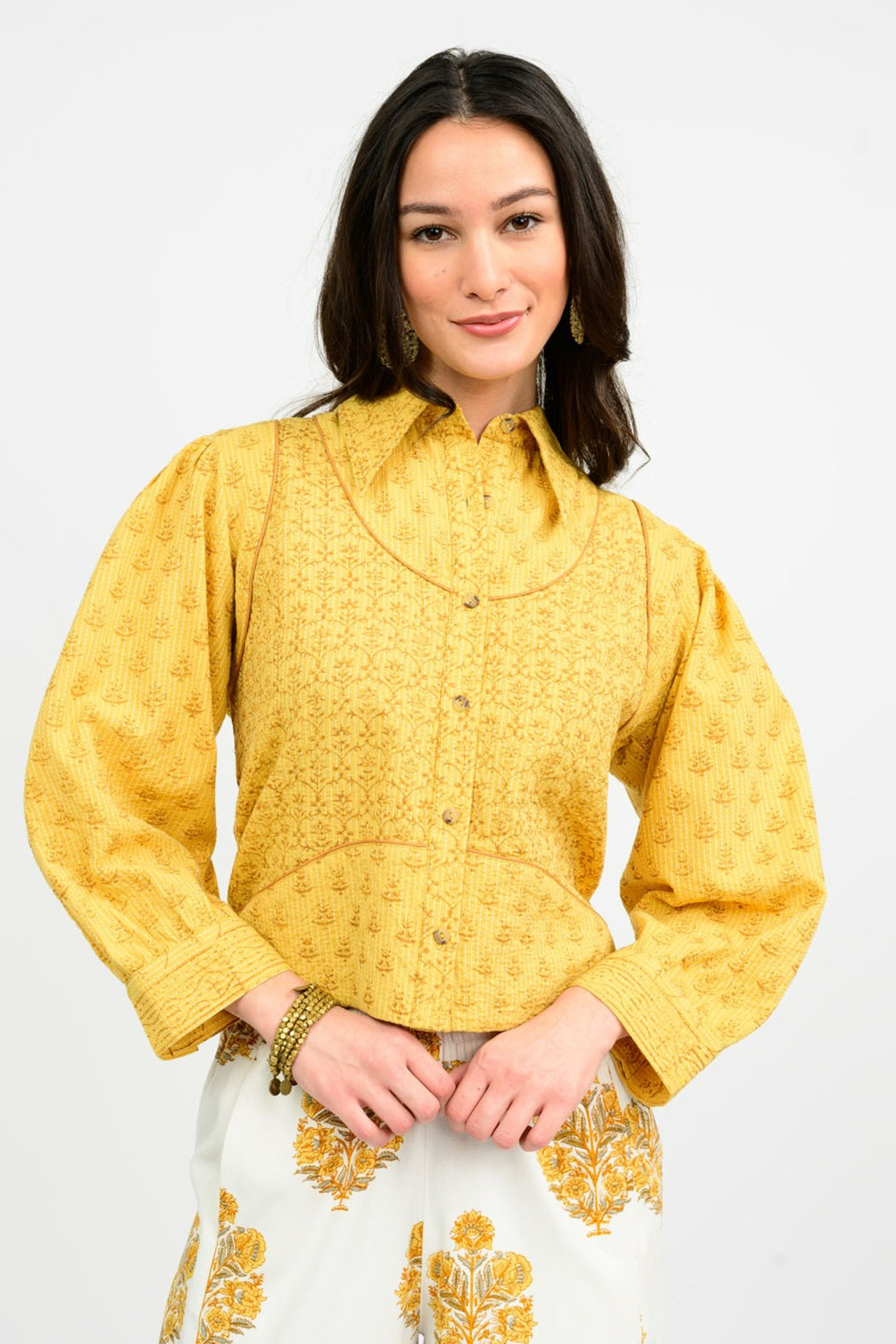 Take on Fall in style with this versatile, 100% cotton button-up from Ivy Jane. In the warmer months, bring it along as a barely-there jacket when the evening cool sets in; as the season nears its end, wear it as a shirt and layer up with denim, brown leather, or knit-wear. The pointed collar, delicately gathered sleeves, and tailored trim keep you looking effortlessly put-together.