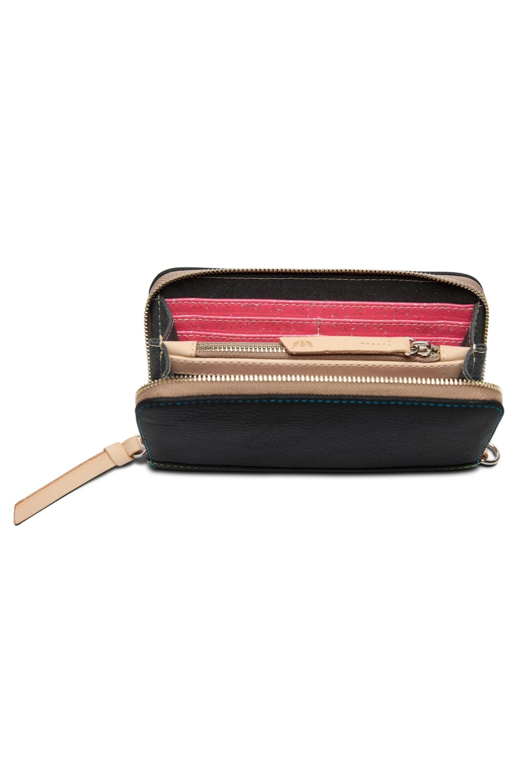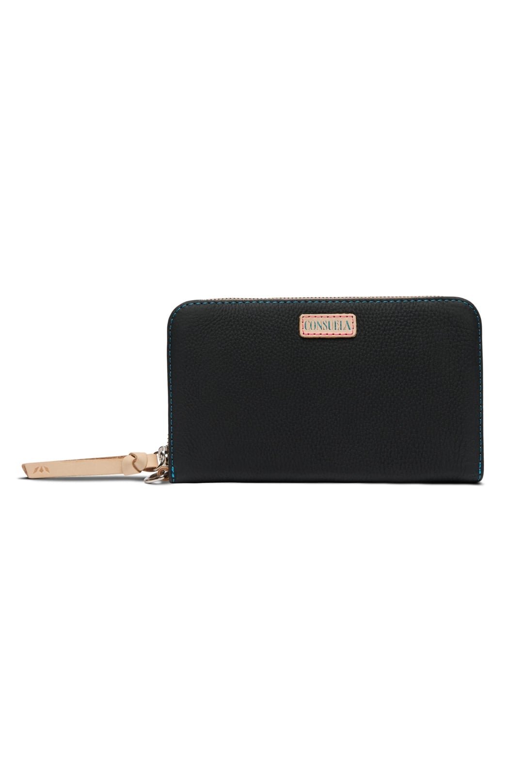 Function and versatility in the palm of your hand. Our new Essential Wallet is a streamlined, large capacity wallet with tons of room for cards, cash, and receipts — plus a zippered center compartment for coins and keepsakes. We added a D-ring so you can easily clip it to any Consuela wristlet strap or anchor onto an inside lanyard for added security. Details & Sizing: - Cyndi black pebble leather exterior and trim - Zipper closure - Two interior slide pockets - Twelve credit card slots - Trimmed in natural, untreated leather - 7 ¾” (W) x 4 ¾” (H) x ¾” (D) - Made in Mexico