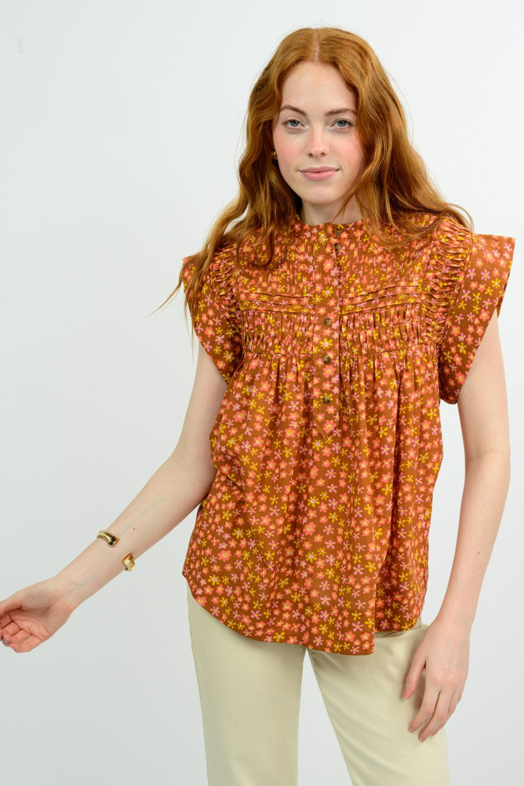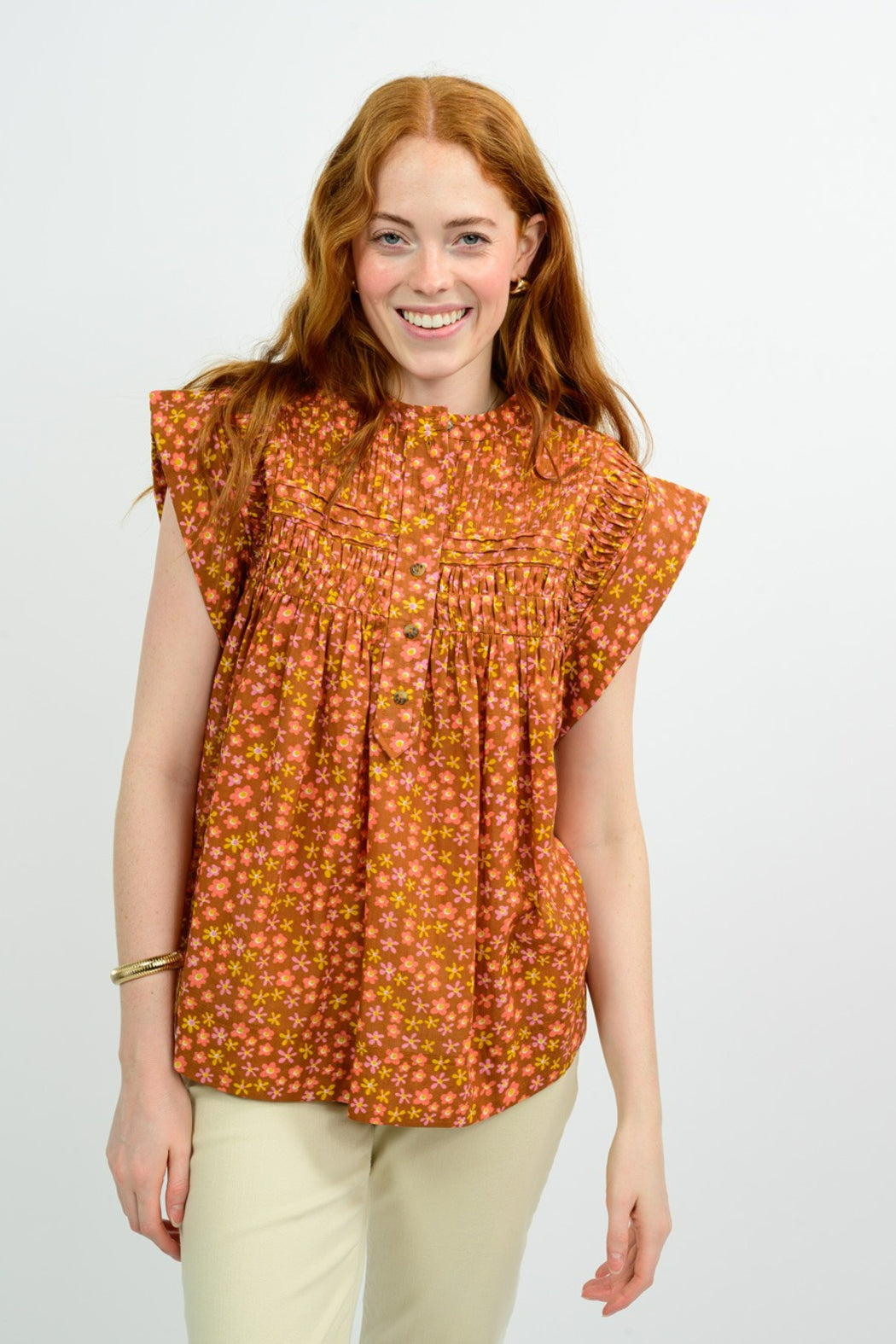 This easy breezy top is perfect for summer! Pair it back to your favorite denim or white pants for an effortless look. Features include muscle cuff sleeve with added panel under arm making it a bra friendly top, henley buttons, and smocking detailing. Stay cool and cute! 100% Cotton, Made in India