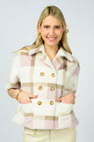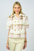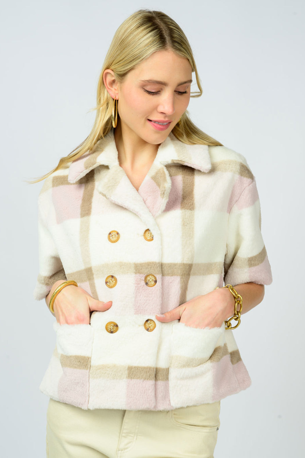 This faux fur short sleeve jacket/top is oh so cute and cozy. We love the plaid pattern in taupe, pink, and ivory with double button front. Pair this with jeans, slacks or over a little dress. 100% Polyester