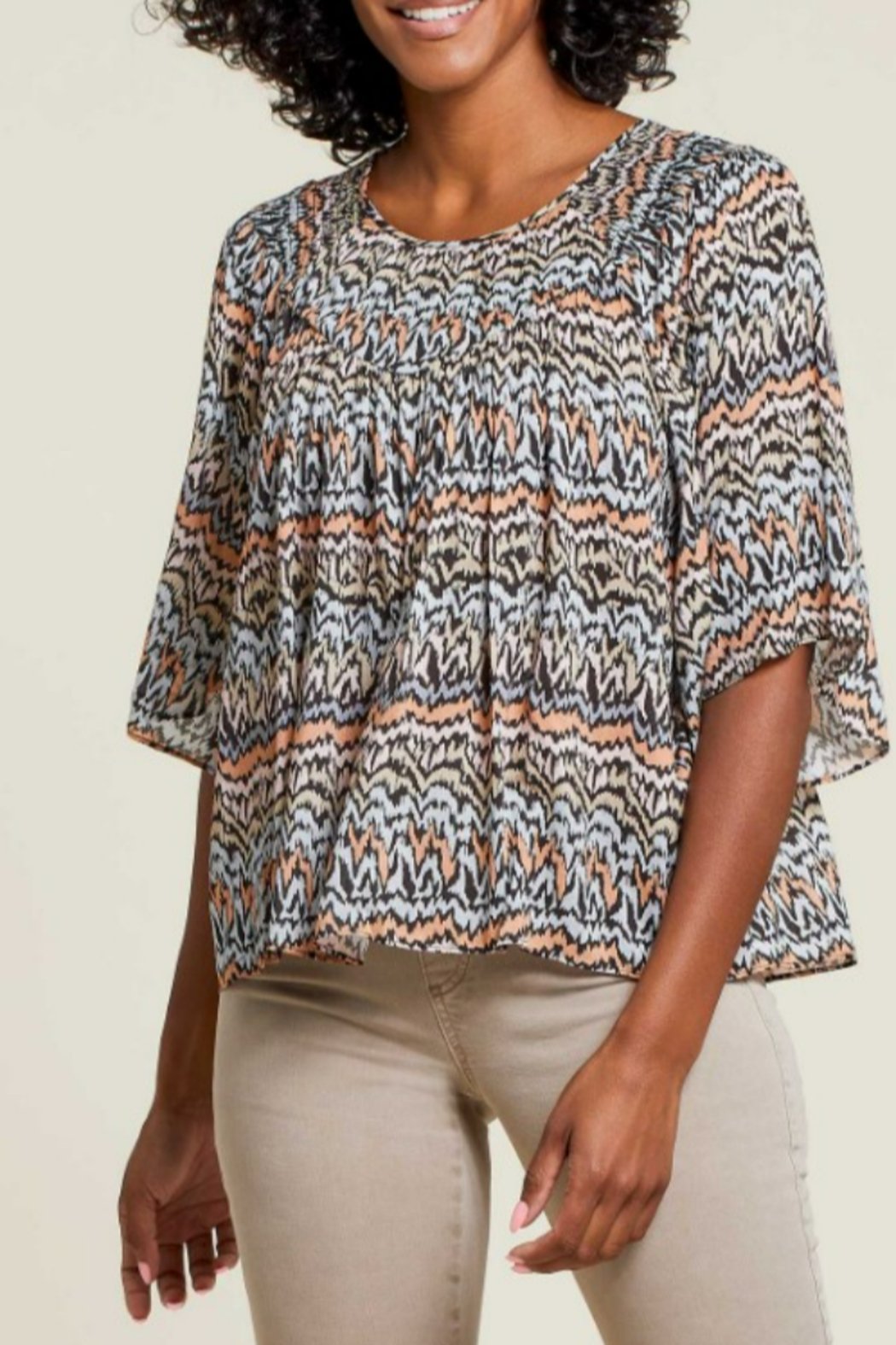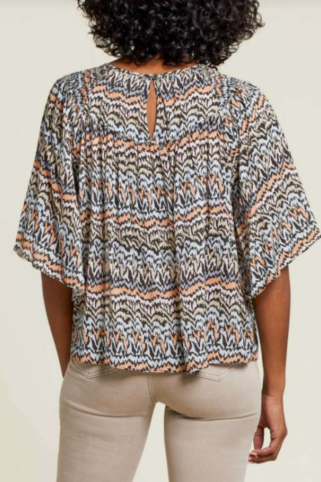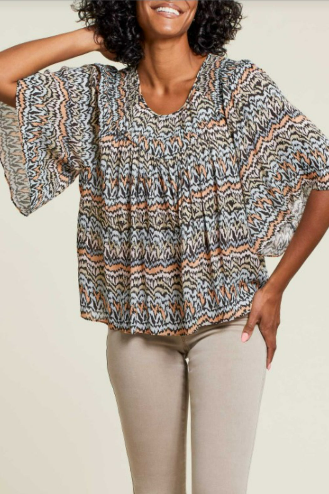 The long wait for the perfect top is over, and we're ecstatic to show it off. Flaunting a fit with plenty of flow, smocked details, elbow-length flutter sleeves, and chic printed dot fabric, it pairs well with all of your staple pieces.
