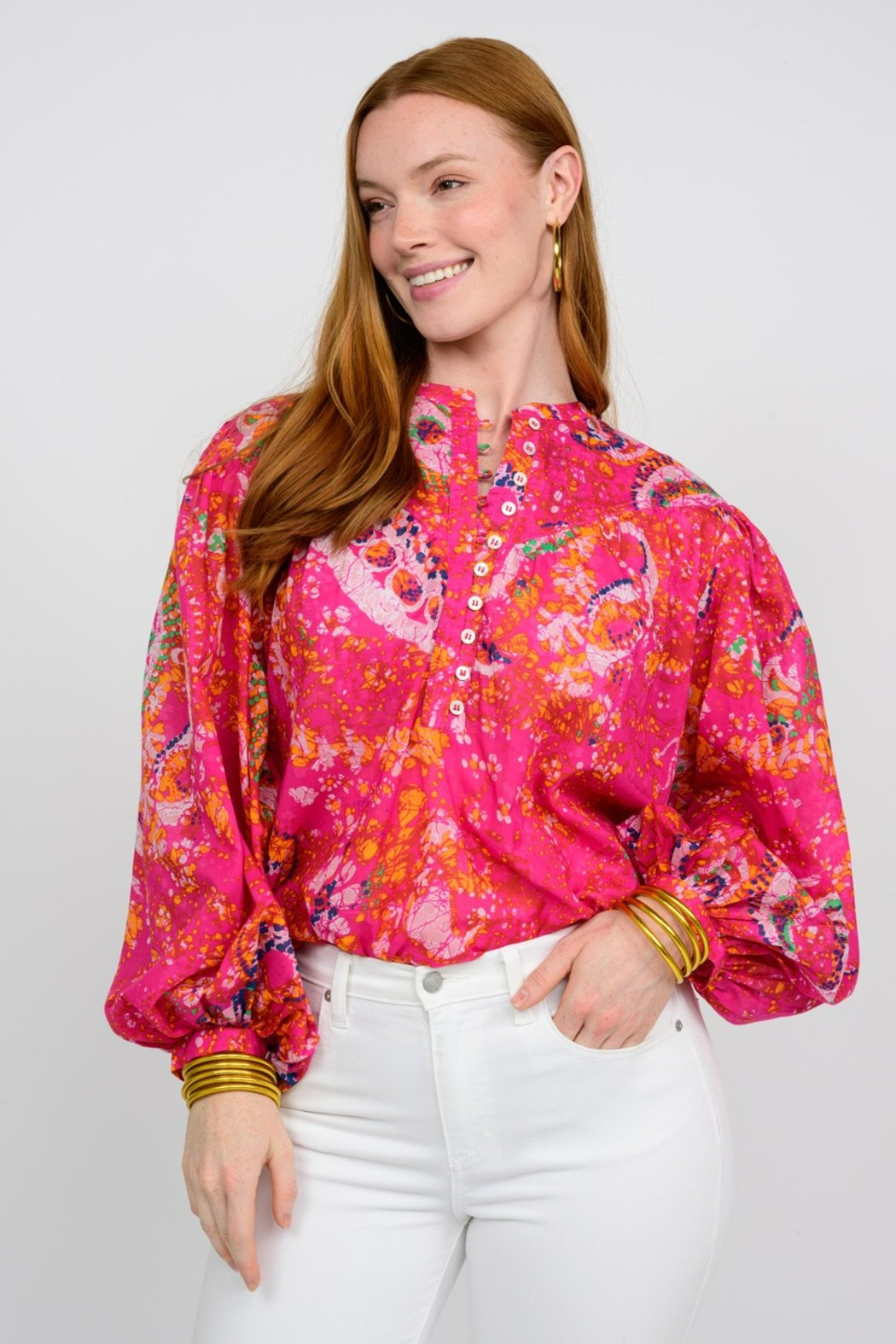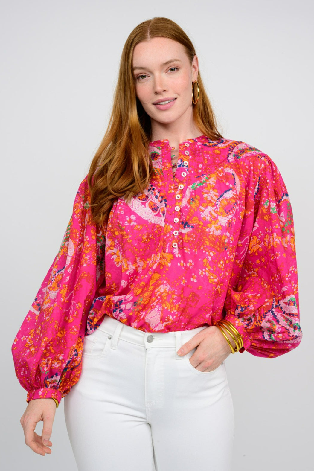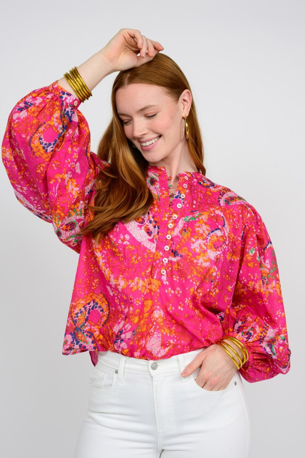 Super cute printed top from Ivy Jane. We love the bold pink color, the 3 quarter sleeve, and button detail down the front. Wear it back to white denim or a denim skirt for a cute comfy look for Spring or Summer. 100% Cotton, Made in India