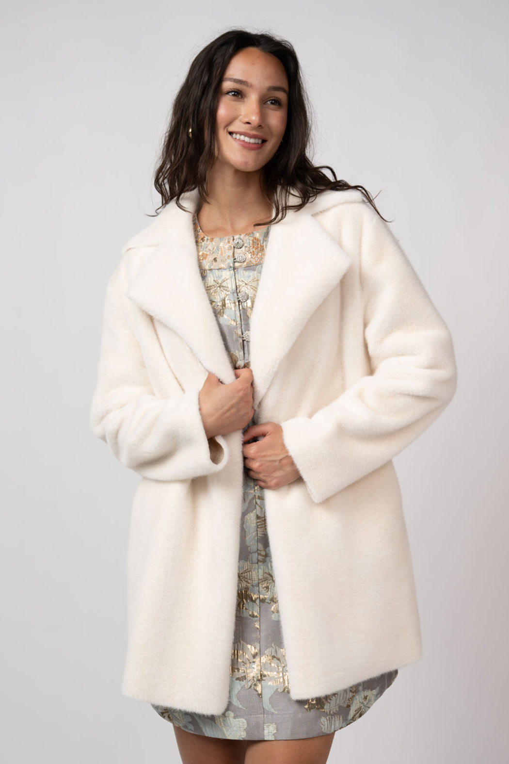A plush faux fur suede coat with a soft, textured finish and a relaxed tailored silhouette. The Faux Fur Suede Coat from Ivy Jane / Uncle Frank features a wide notched collar and hits mid-length for versatile layering. Cozy yet polished, it pairs as easily with dresses or casual denim for cooler days. Finished in a creamy neutral, this coat elevates everyday outfits with luxe texture.