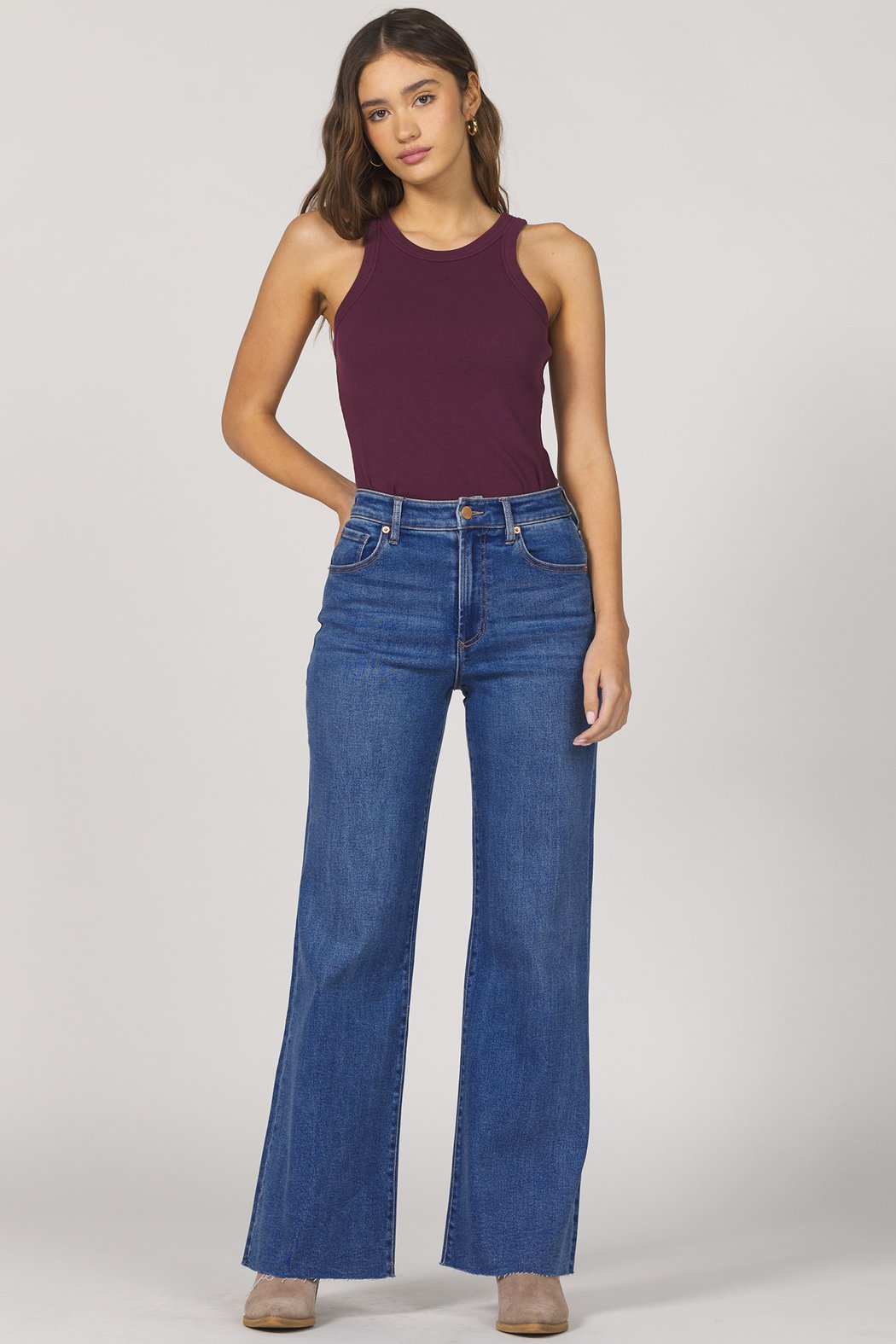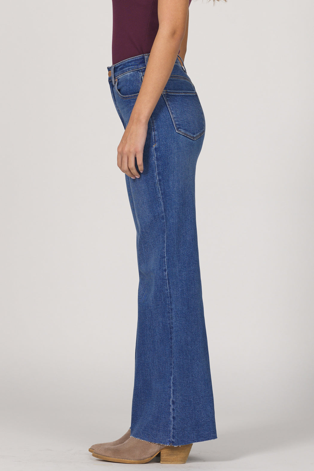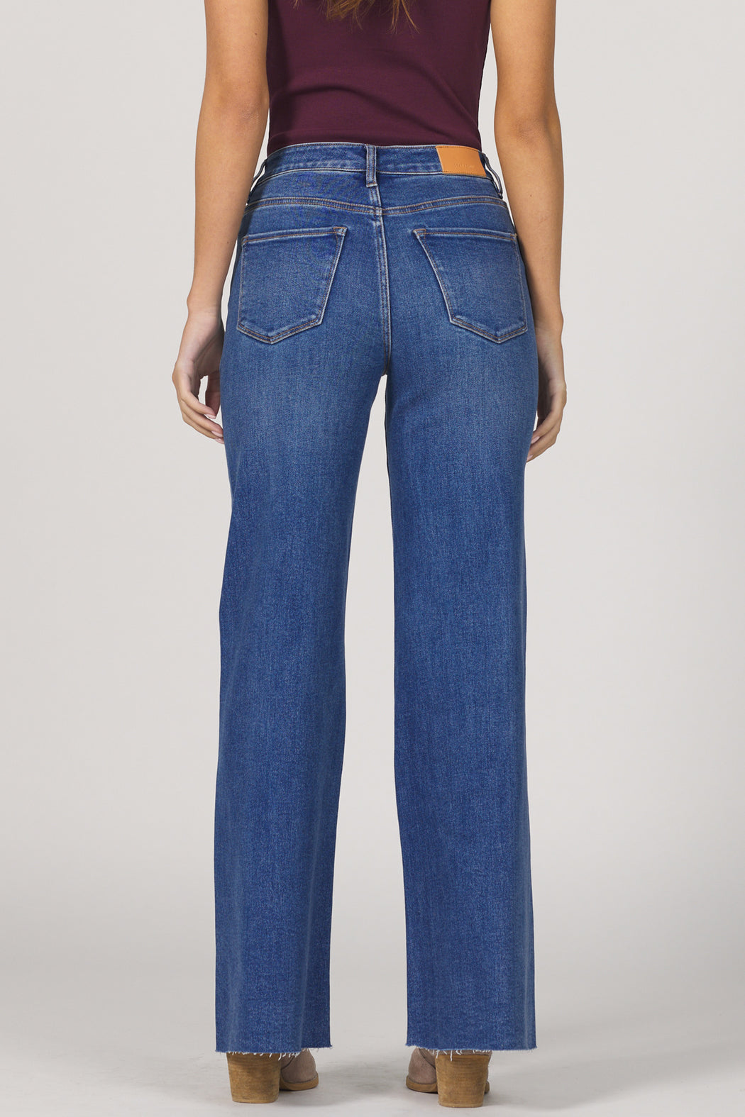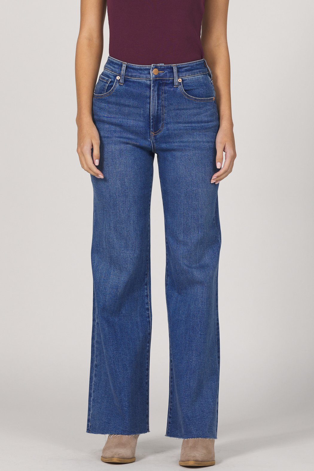 Elegance of the Fiona wide leg jean in Midtown wash, designed for the modern fits with high-rise that redefines chic with their cut-off hem, offering a contemporary twist on a classic silhouette.