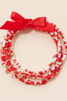 Bright seed beads and a playful ribbon bow give this set a spirited, game-day feel. The Gameday Seed Bead Bracelet Set features multiple stretchy strands of red, white, and gold-tone beads for layered wrist styling. Frem designed the bracelets to be lightweight and easy to stack with everyday looks or team-day outfits. Wear them alone or mix with other bracelets for a casual, festive vibe.