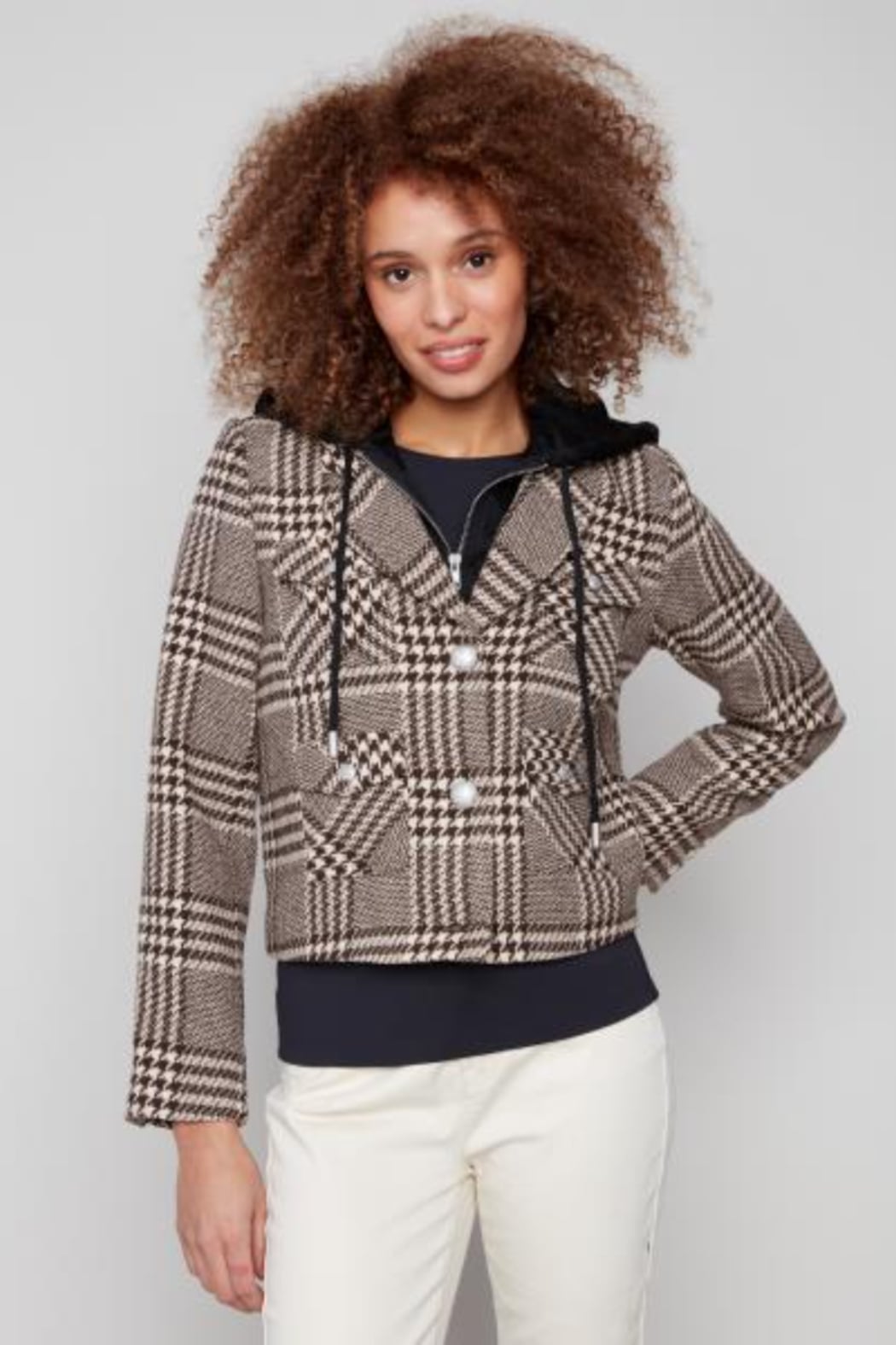 Step out in stylish comfort with Charlie B's Glenn Plaid Hooded Jacket. This charming jacket features a classic plaid pattern in versatile shades of brown, black, and cream, offering a timeless appeal. The design is elevated with a practical contrasting black hood and functional flap pockets on the chest, each secured with a stylish button. A front zip closure and adjustable drawstrings at the hem allow for a customizable fit, while the slightly cropped length adds a modern touch. Perfect for transitional weather, this hooded jacket combines classic pattern with contemporary utility.
