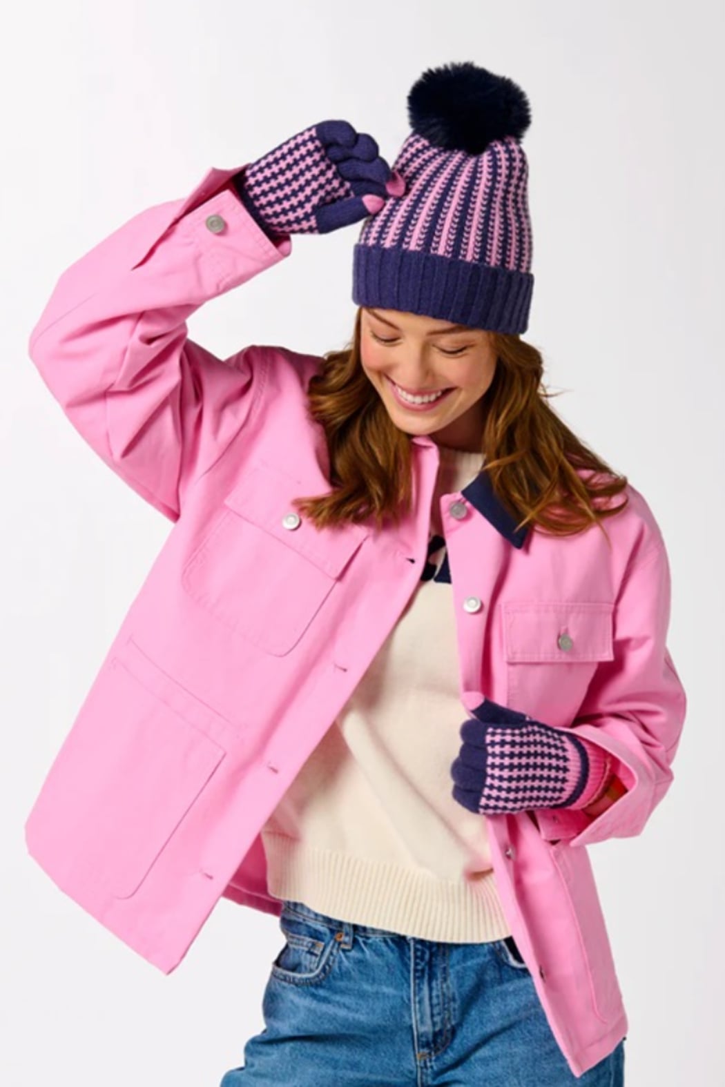 Brighten up your cold-weather look with the Hadley Beanie, featuring bold colors, a chunky knit design, and a plush faux fur pom on top. This beanie has a wide ribbed cuff for a snug fit and a cozy feel that’ll keep you toasty from snowy strolls to coffee runs. The playful houndstooth pattern brings just the right amount of charm and character.