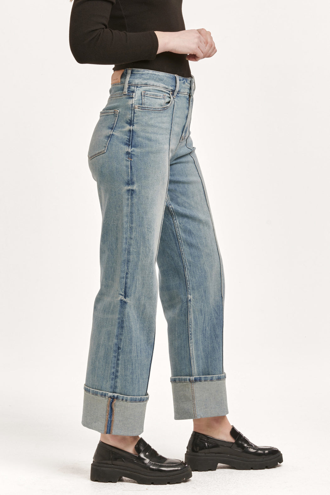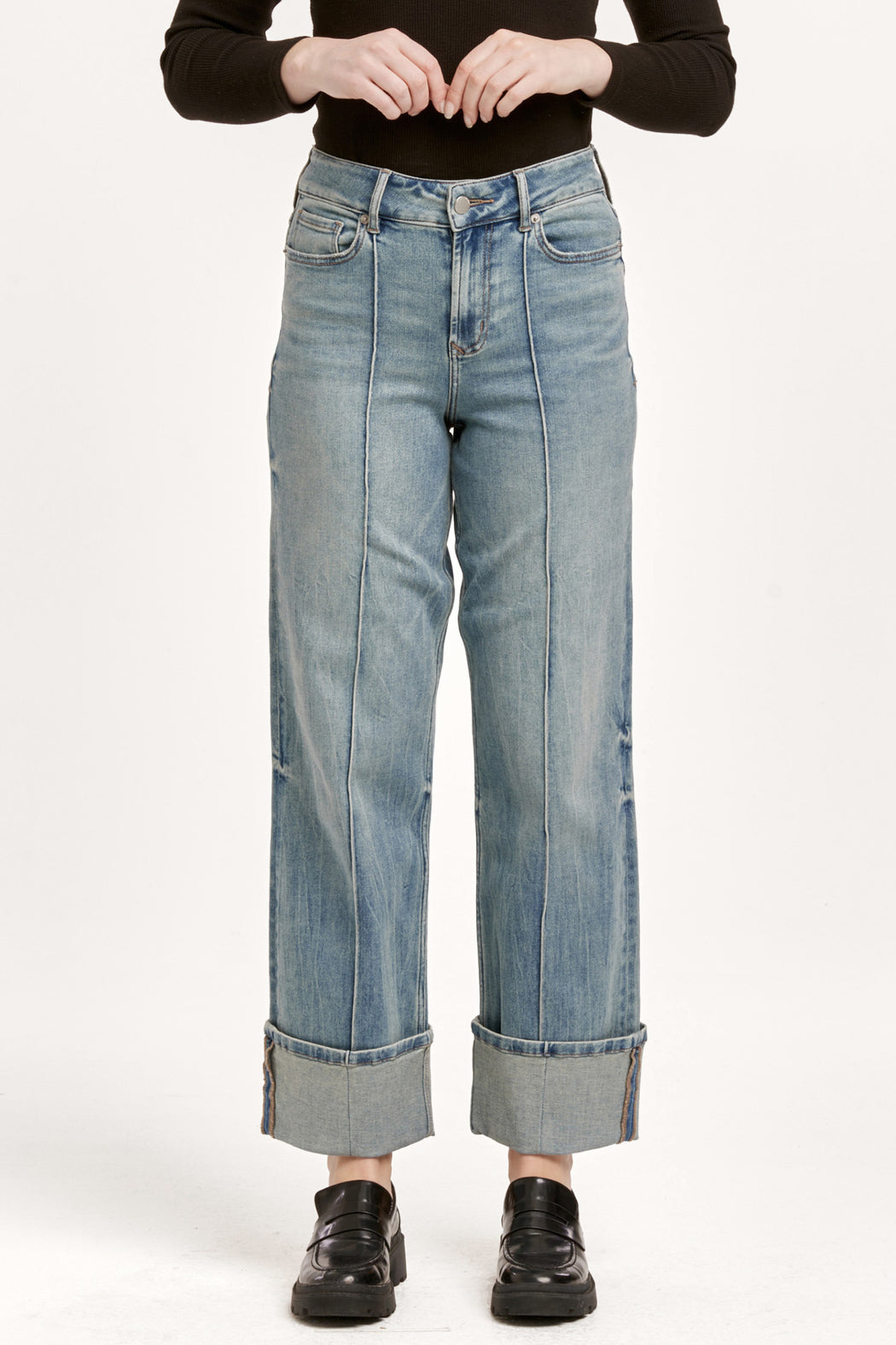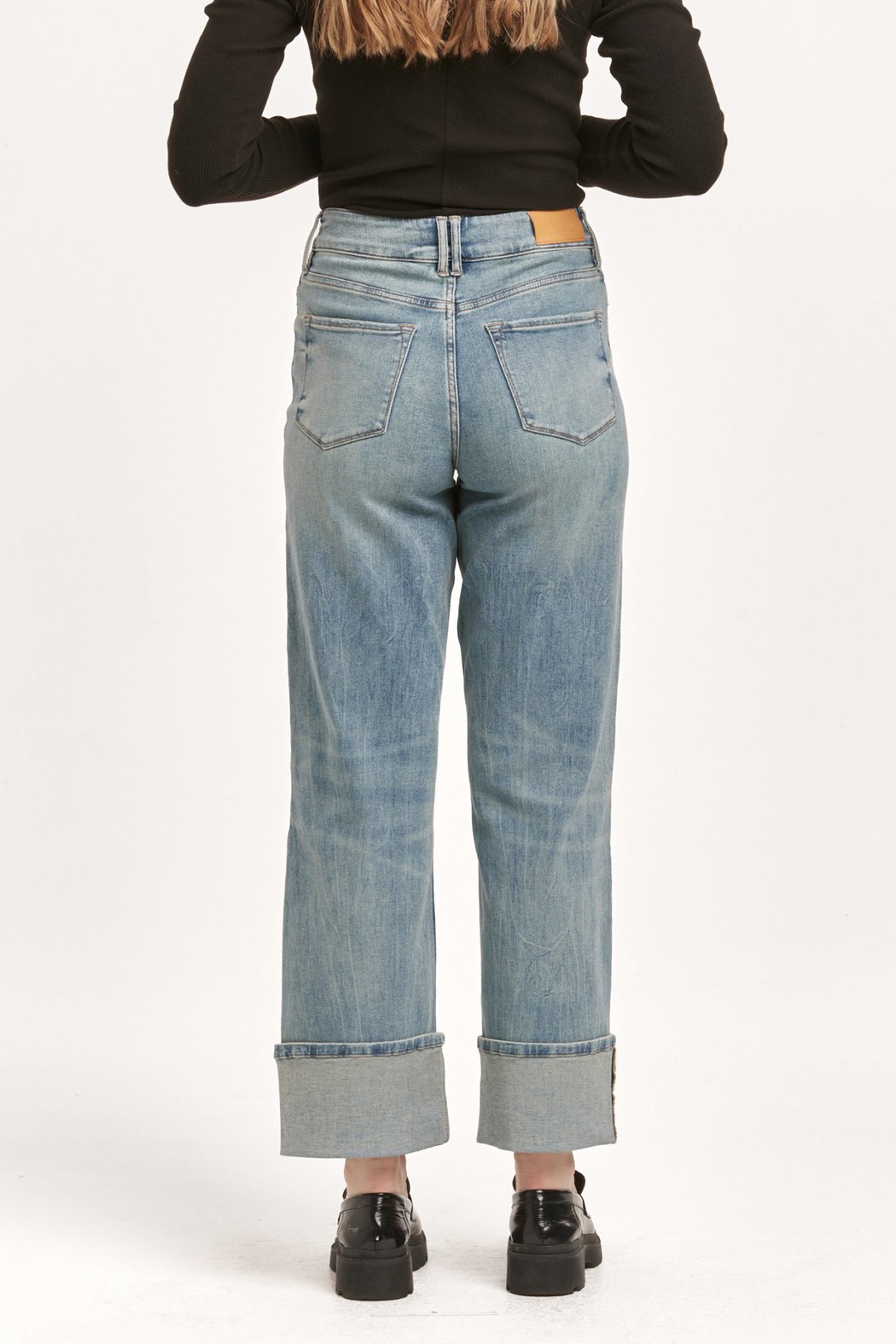Crafted from stretch denim with a cuffed inseam accented with pintuck front center dart seams, hand sanding hip whiskers, marbleize netting effect, pocket grinding, washed in effortless shade for any pairings.