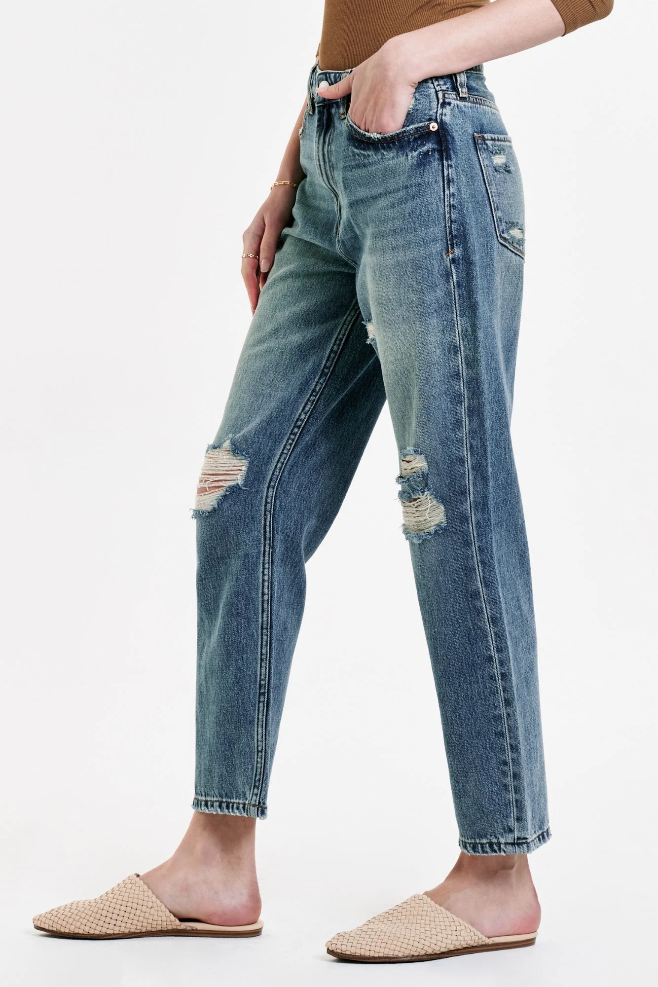 Super high rise cropped straight leg jeans. It's the friendly fit that sits at natural waist and fitted slender from the hip to mid thigh. Cropped inseam on rigid (non-stretch) denim accented with designer placed destructions, knee cut-out & tears, hand sand whiskers at hip, grindings on pockets & leg opening.