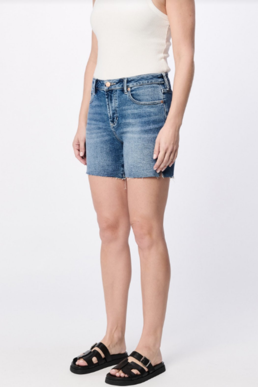 Step into effortless style with the Julian shorts in medium wash, featuring a chic mid rise and raw cut hem for a casual yet polished look.