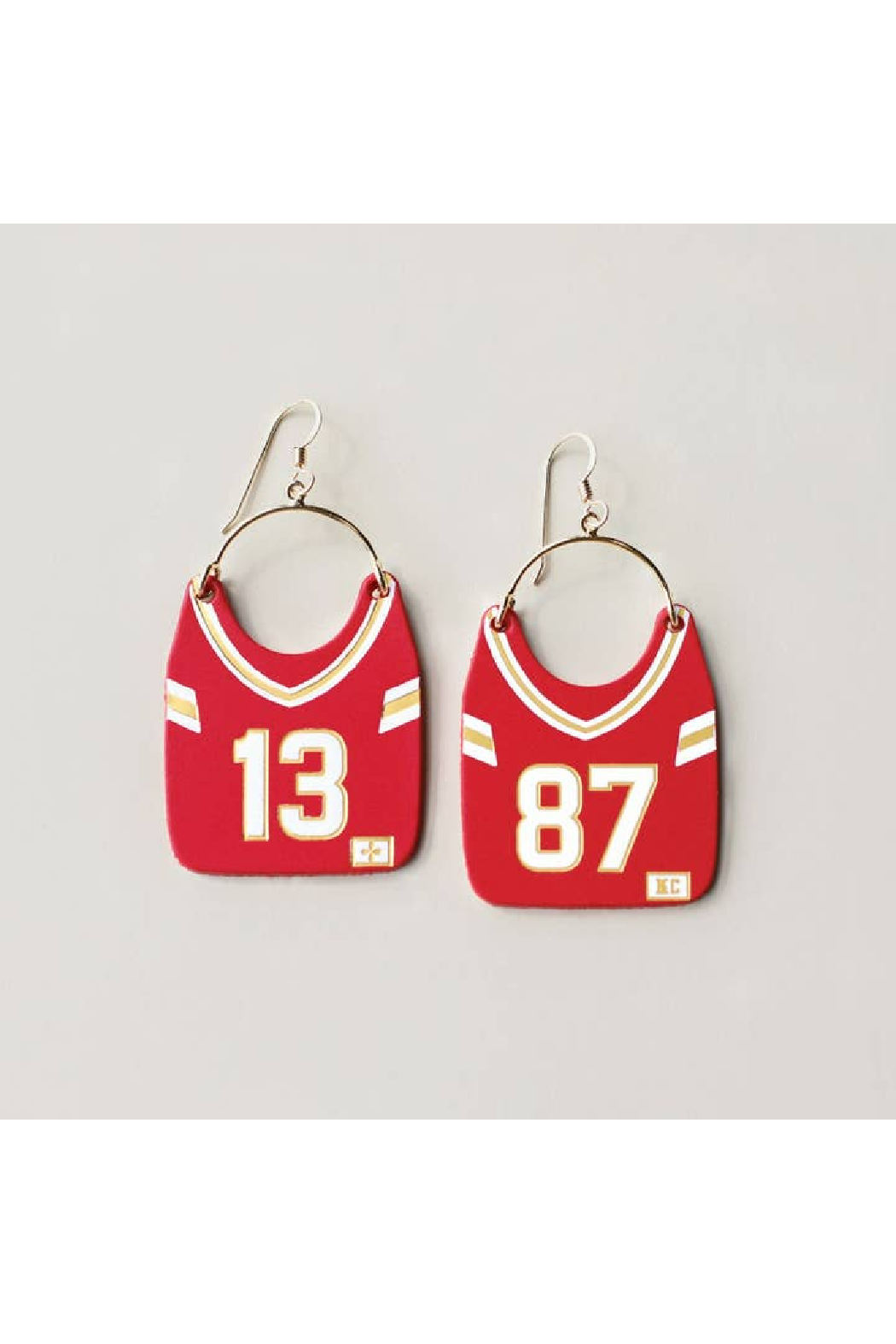 Elevate your game day look with our Kansas City Jersey #13 and 87 Earrings! These one-of-a-kind jersey shaped Chiefs earrings are designed to honor our hometown team. You'll be the MVP of stadium style when you sport this pair to any tailgate, watch party, or game! Show off your team spirit or gift them to the biggest fan you know.