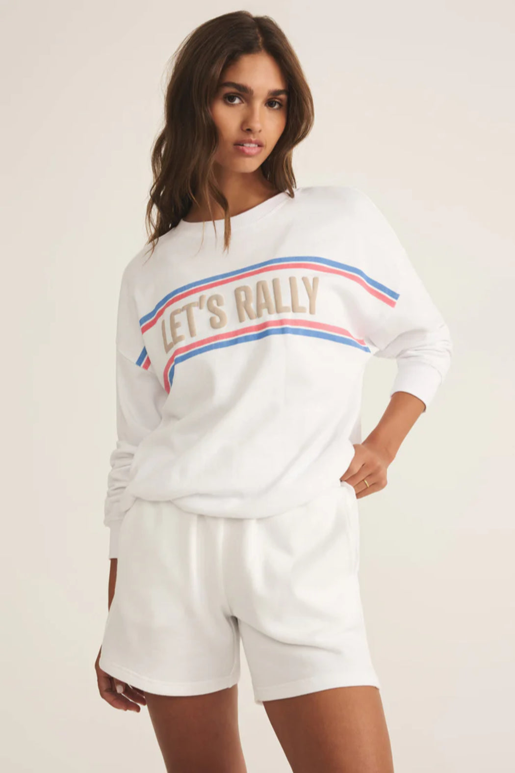 Sporty and effortlessly cool, this oversized sweatshirt is made from 100% cotton for a soft, lived-in feel. Featuring bold “Let’s Rally” graphics in puff ink, it’s the perfect post-workout layer.