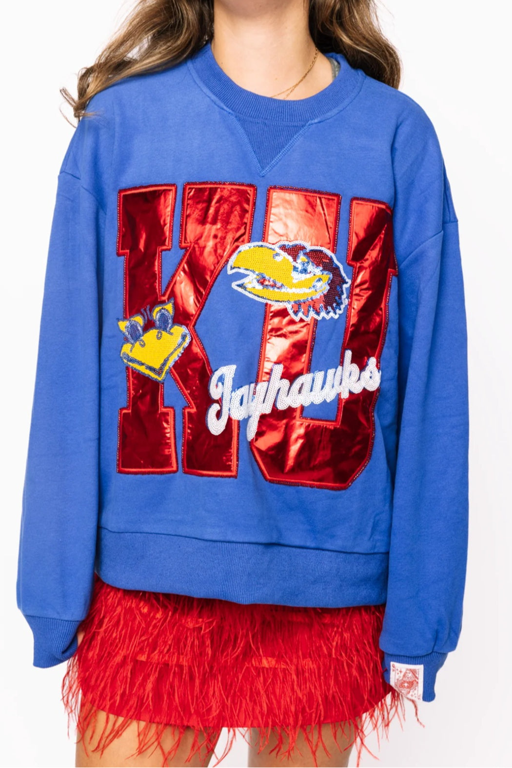Dazzle everyone at the game with this metallic University of Kansas sweatshirt. Featuring a bold, metallic "KU" front and center, sequined Jayhawk icons, and the Queen of Sparkles' signature playing card logo shimmering on the sleeve, this sweatshirt will have you standing out in style!