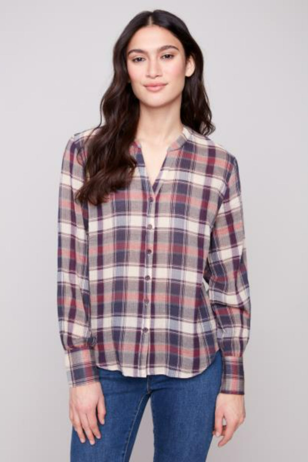 A classic plaid top but with a key hold button up neckline. This light fabric makes for a great transitional top to fall. Pair back with your favorite denim or our burgundy jeans from Dear John.
