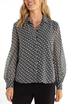 This Liverpool Sheer Printed Button-Down Blouse is a relaxed, collared top cut from a lightweight, semi-sheer fabric with an allover white geometric print on black. It features a classic shirt collar and full-length bishop sleeves finished with buttoned cuffs for a polished look. The button-front silhouette and gentle drape make it versatile for both work and casual weekends. Pair it with tailored trousers or jeans for effortless, elevated styling.