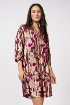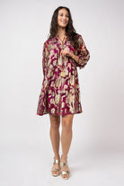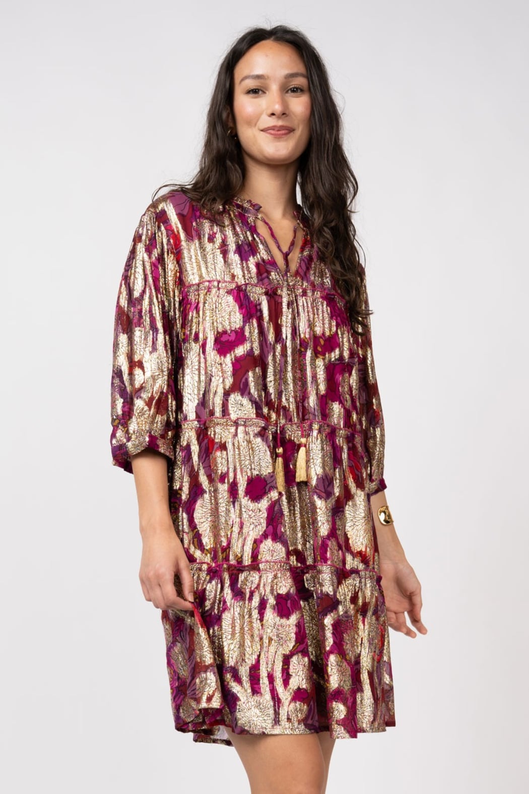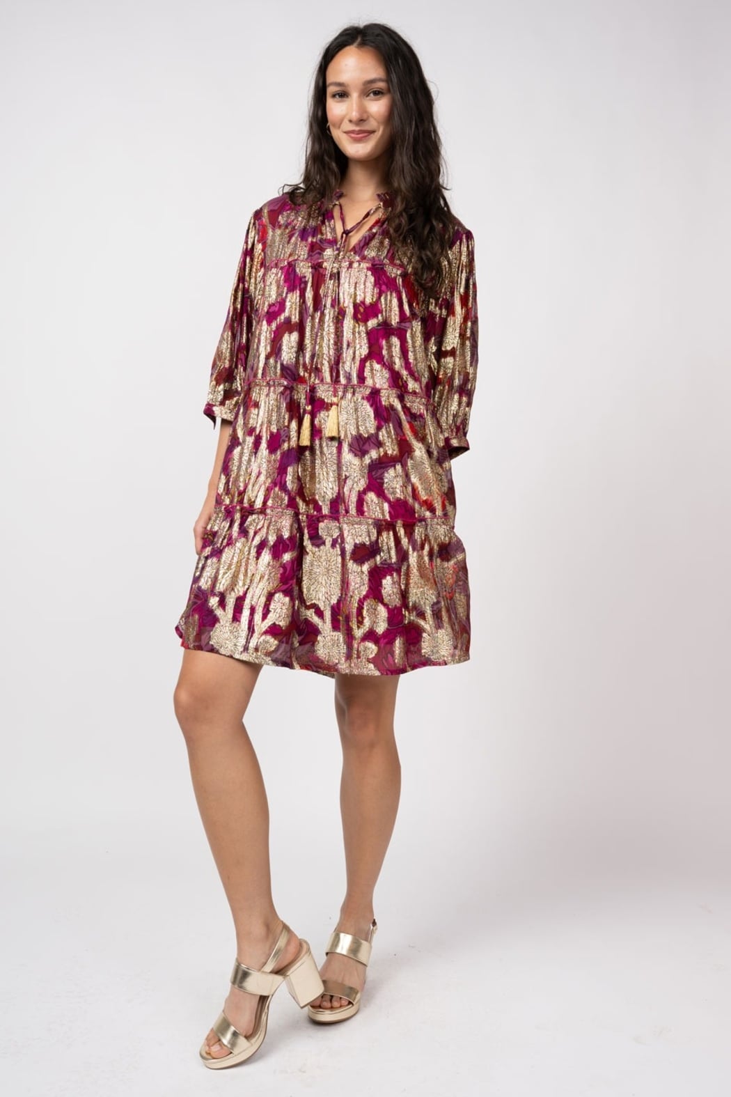 A shimmering tiered silhouette with metallic print gives this easy dress instant party polish. The Metallic Print Tiered Dress from Ivy Jane features a relaxed fit, tassel tie neckline and elbow-to-¾ length sleeves for effortless wear. Lightweight, slightly above‑knee length tiers make it ideal for nights out or vacation looks with a boho‑trendy vibe.
