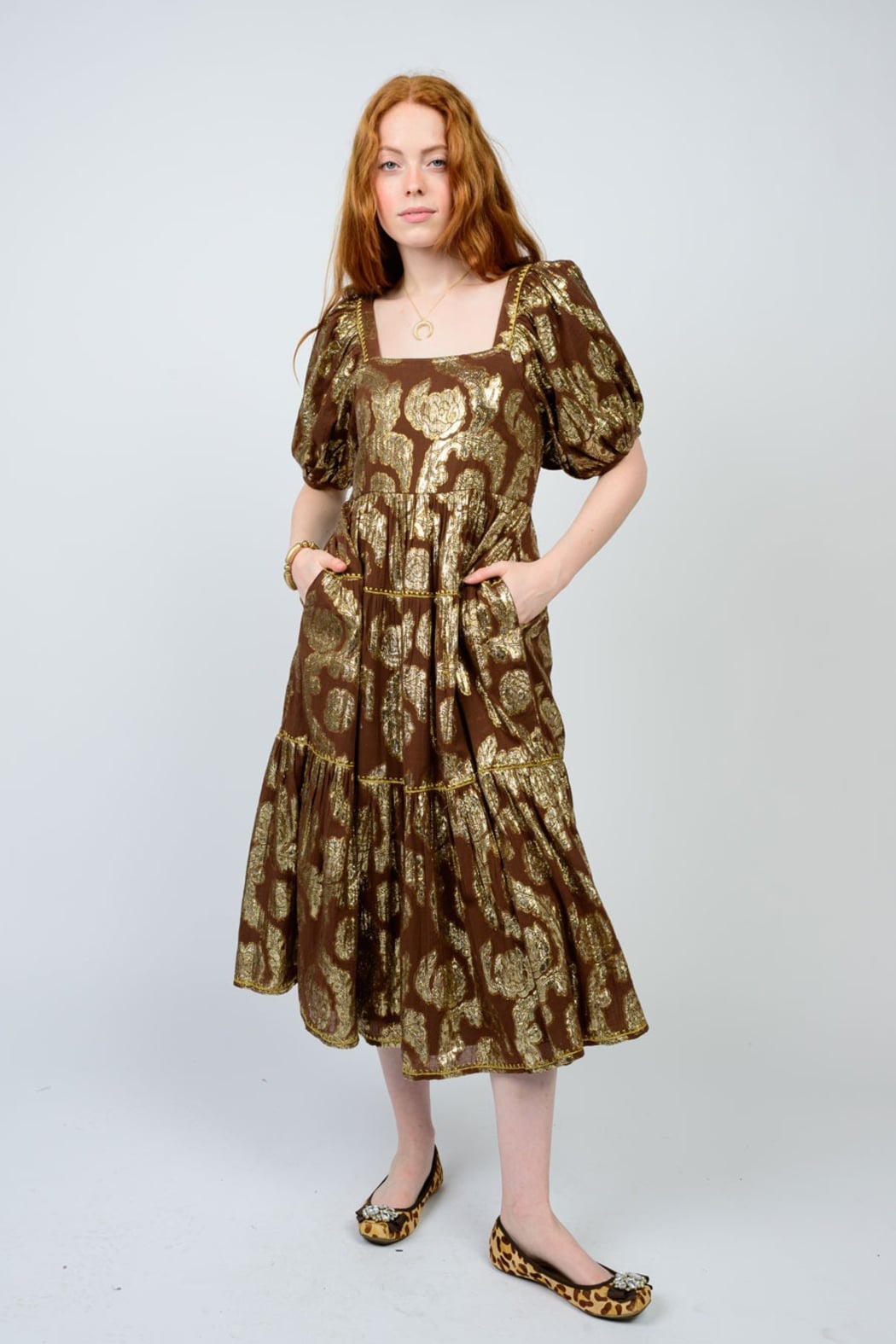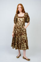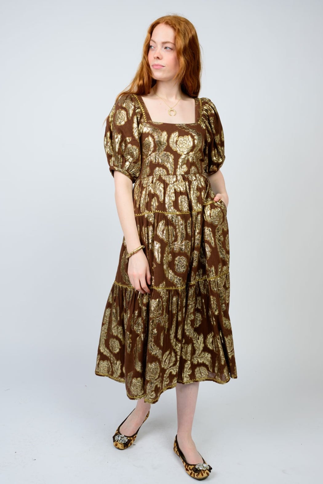 A metallic floral midi with a tiered silhouette and puff sleeves, this piece blends vintage charm with modern shine. The Metallic Roses Midi Dress from Ivy Jane / Uncle Frank features a square neckline, short puff sleeves and a flowing mid-length skirt with gold-foil floral detailing. Wear it to cocktail parties or wedding guest events when you want a romantic, boho-inspired statement.