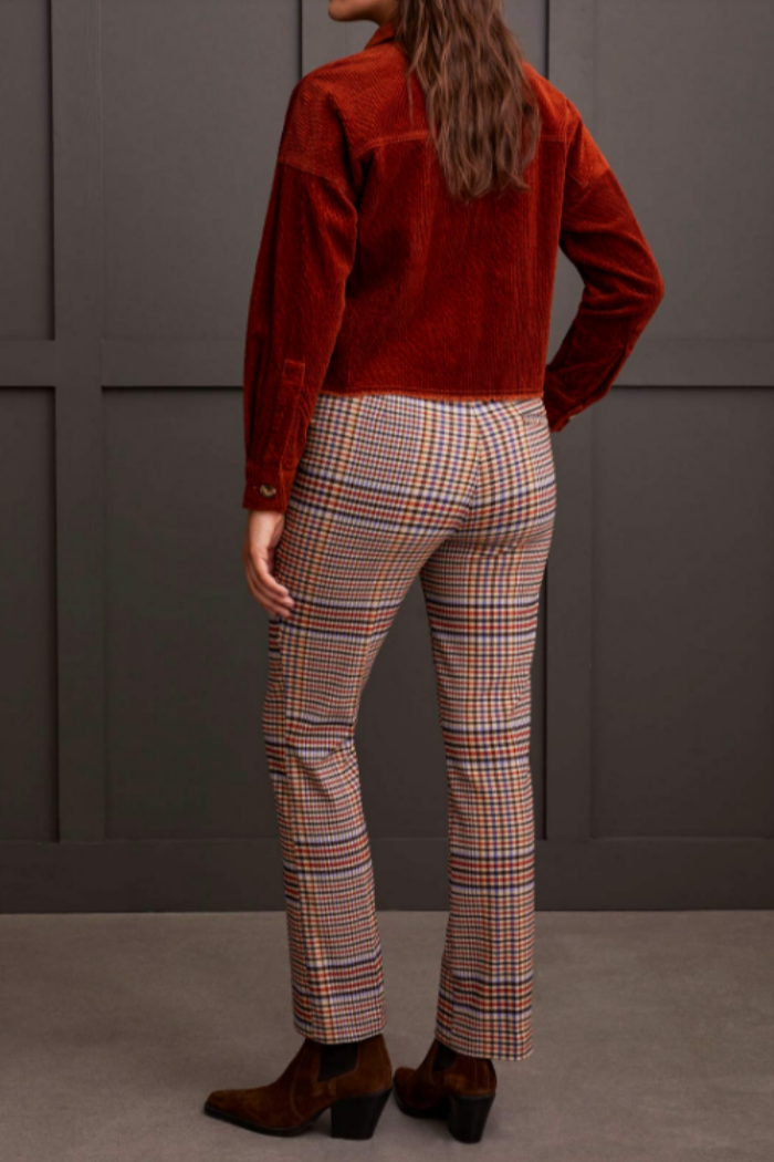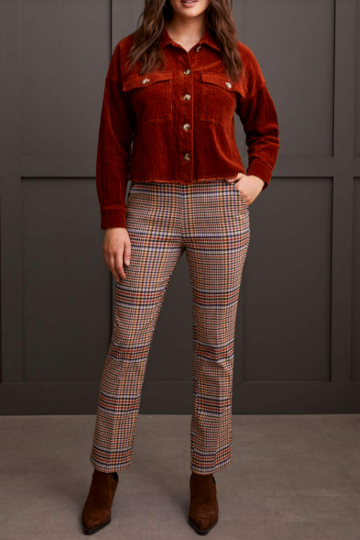 Tackle your daily routine with flair in these pull-on pants, boasting a flattering micro flare leg and a comfortable 30" inseam. Featuring front slash pockets, a decorative back pocket, and crafted from plaid bengaline fabric, they offer a stretchy feel and textured finish for both style and comfort.