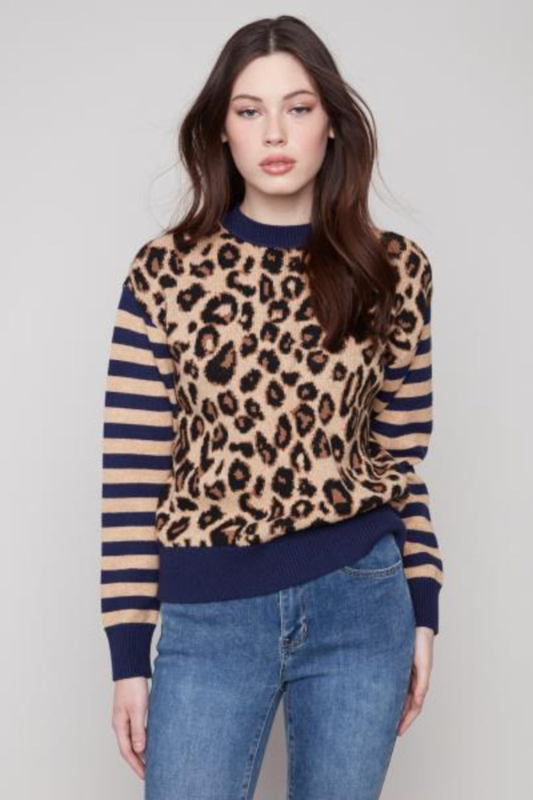 Who doesn't love a fun patterned sweater for fall. This one features cheetah print and then stripes on the sleeves. We love the neutral colors and navy to go back with denim so easily.