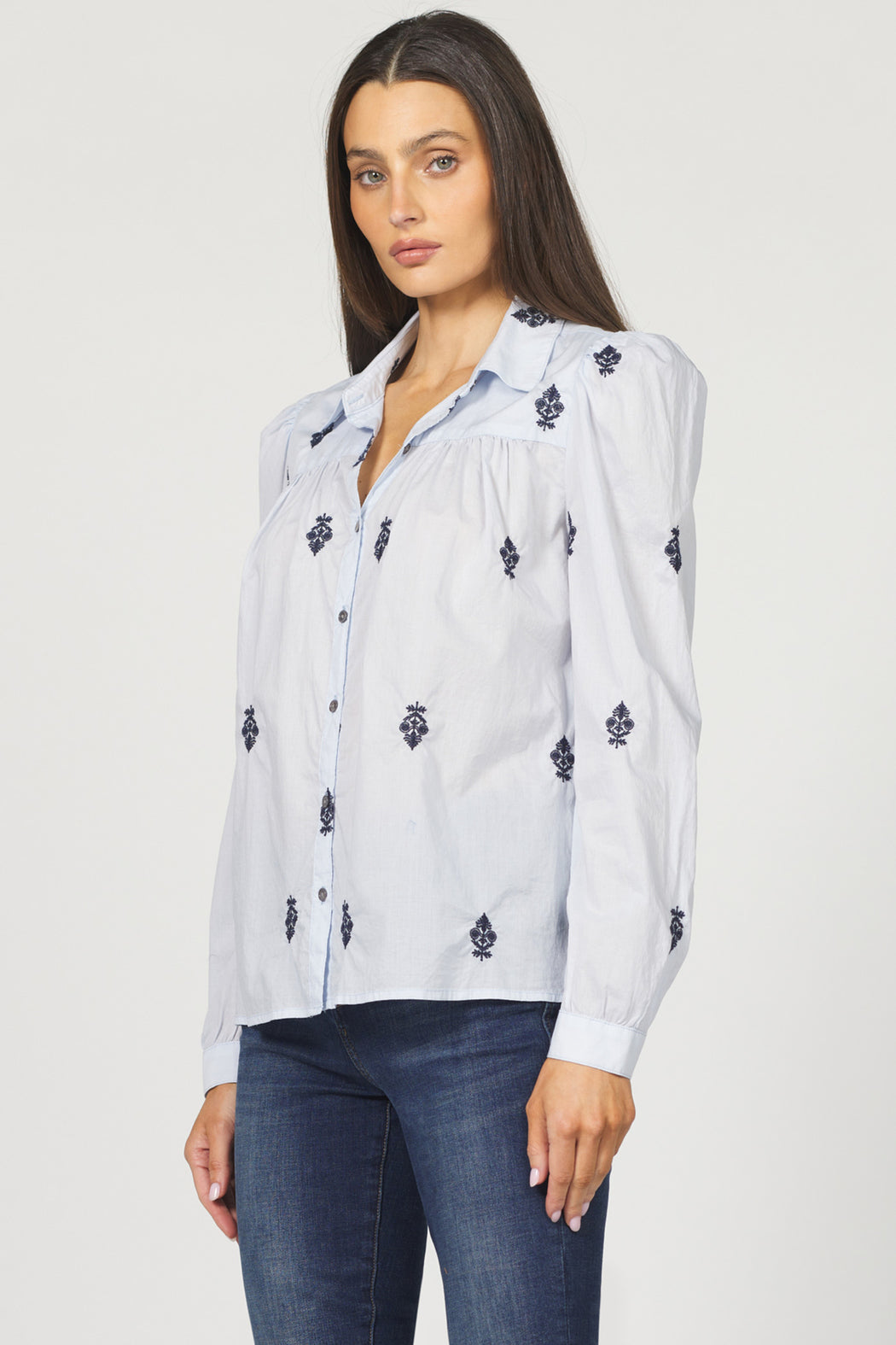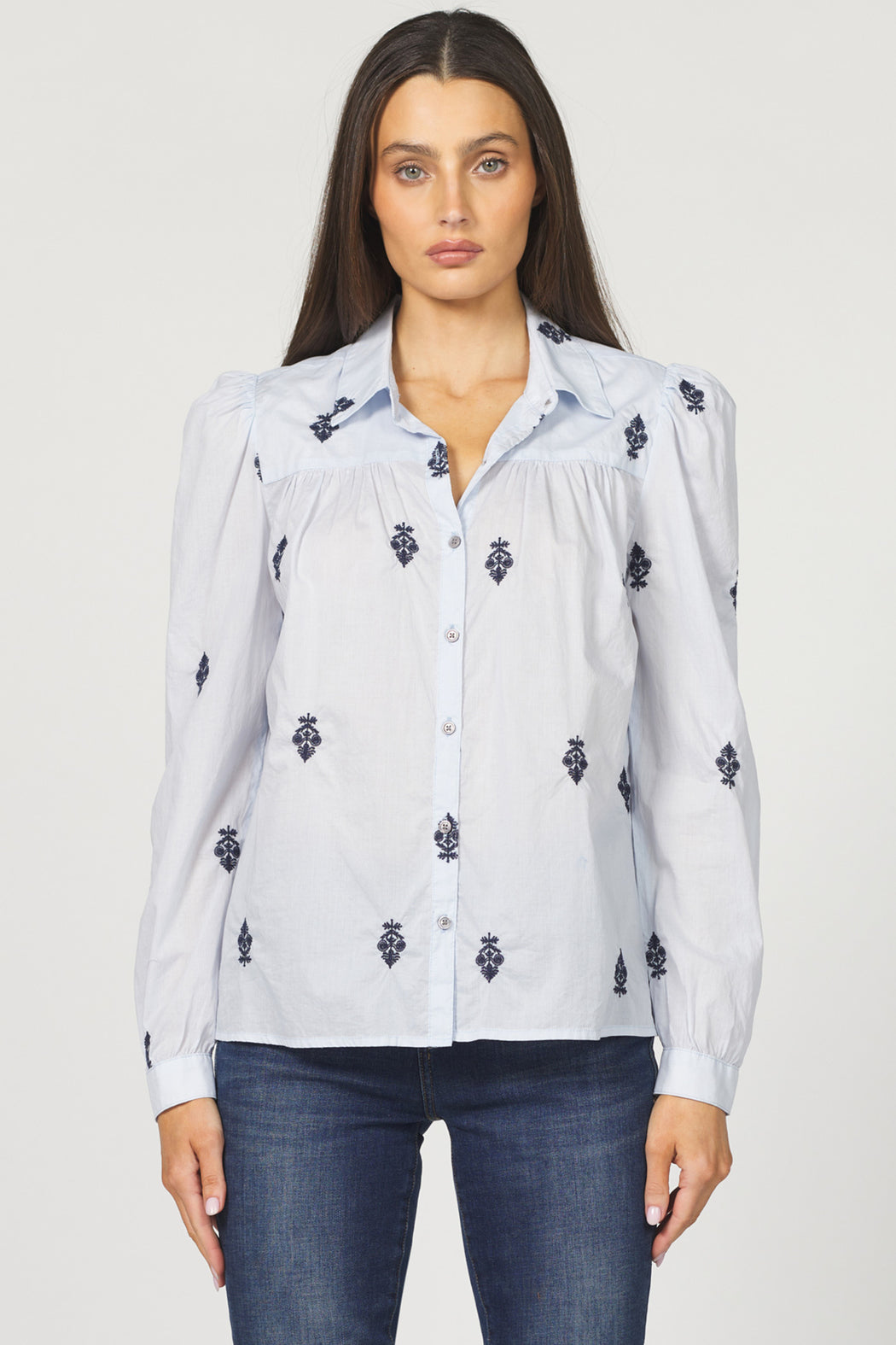 Embrace chic style with this sharp, 100% cotton button-up blouse from Dear John. This structured shirt is given movement by the gathers on the front, back, shoulders, and at the cuff of the long sleeves. Eye-catching embroidered insignias give the fabric a tastefully minimalist pattern. Whether you decide to tuck it in, leave it out, or do a little French tuck, you are sure to stun in this top.