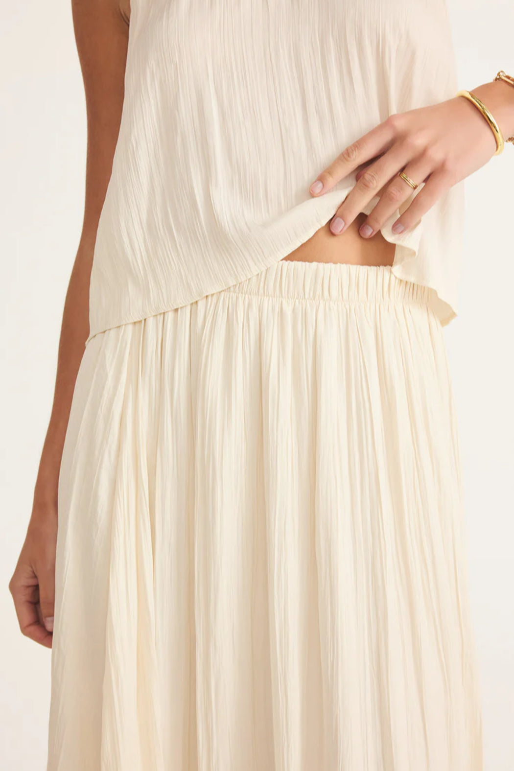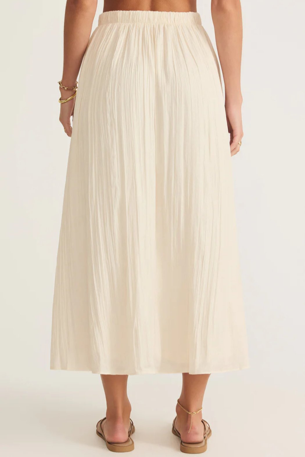 Soft, flowy, and endlessly wearable, this crinkle midi skirt is your new go-to. With a silky feel, a comfy elastic waist, and a relaxed fit, it’s the perfect piece to dress up or down. - Relaxed fit - Poly Satin: 100% Polyester - High rise - Midi Length - Fully lined - Elastic waistband - Heavy soft wash - Hand Wash Cold Separately, Leave Garment Twisted to Dry or Dry Clean