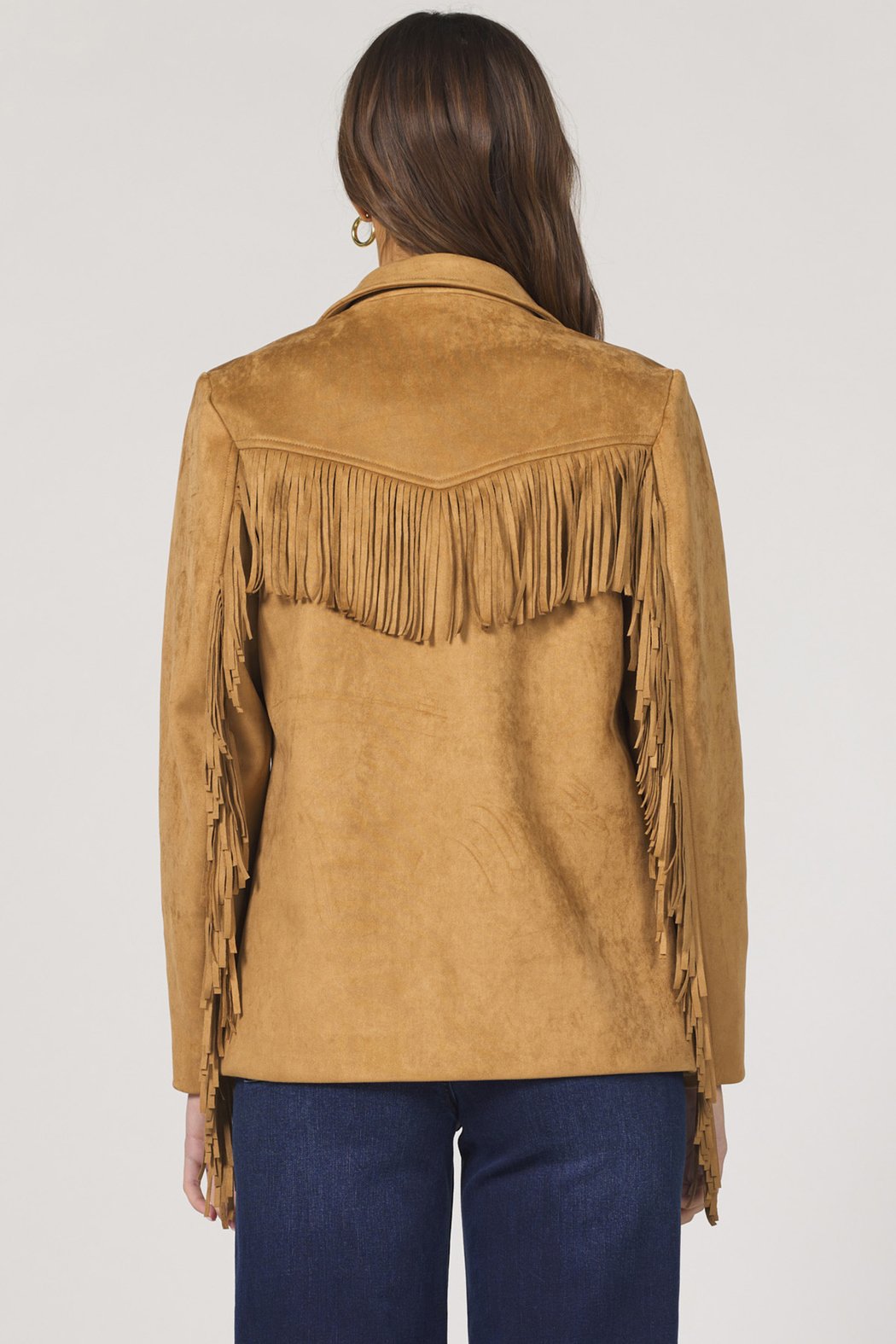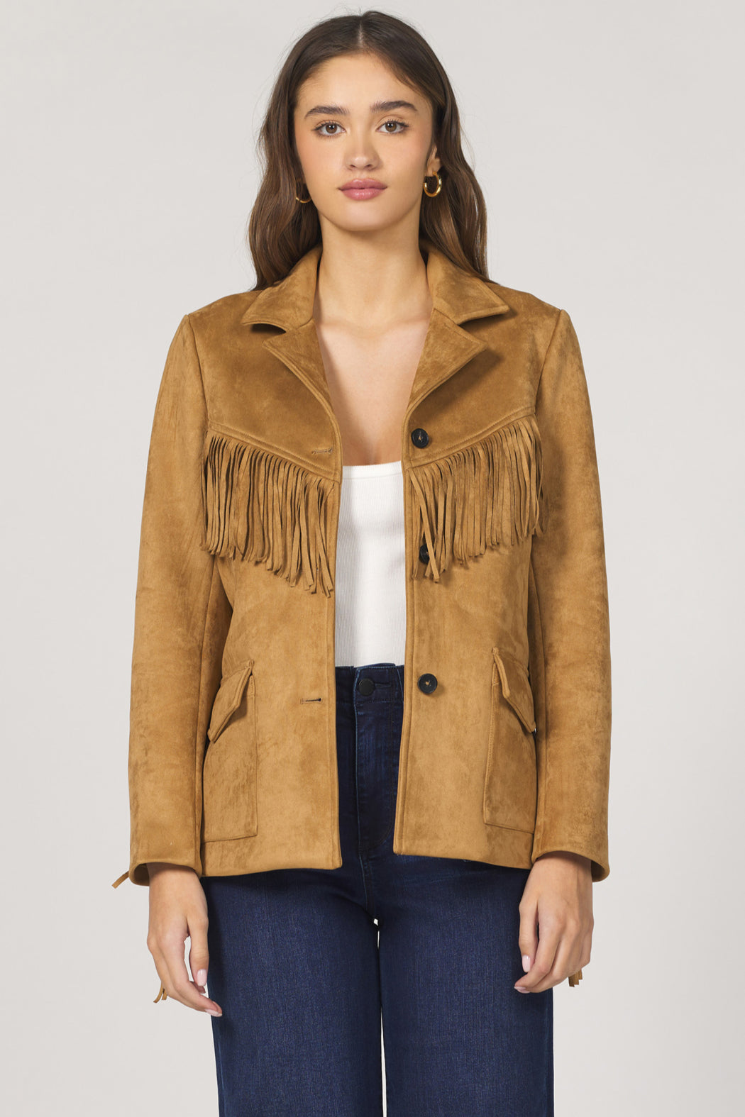 Embrace your inner trailblazer with Dear John's Oakley Fringe Jacket. This stunning piece captures the spirit of the Wild West with its classic silhouette and playful fringe detail that cascades across the chest. Crafted from a soft, faux suede in a rich, warm tone, this jacket features a notched collar, button-down front, and subtle front pockets for a timeless feel. Perfect for adding a touch of rustic charm to any outfit, it pairs beautifully with denim for a casual-cool look or over a dress to give it an unexpected edge.
