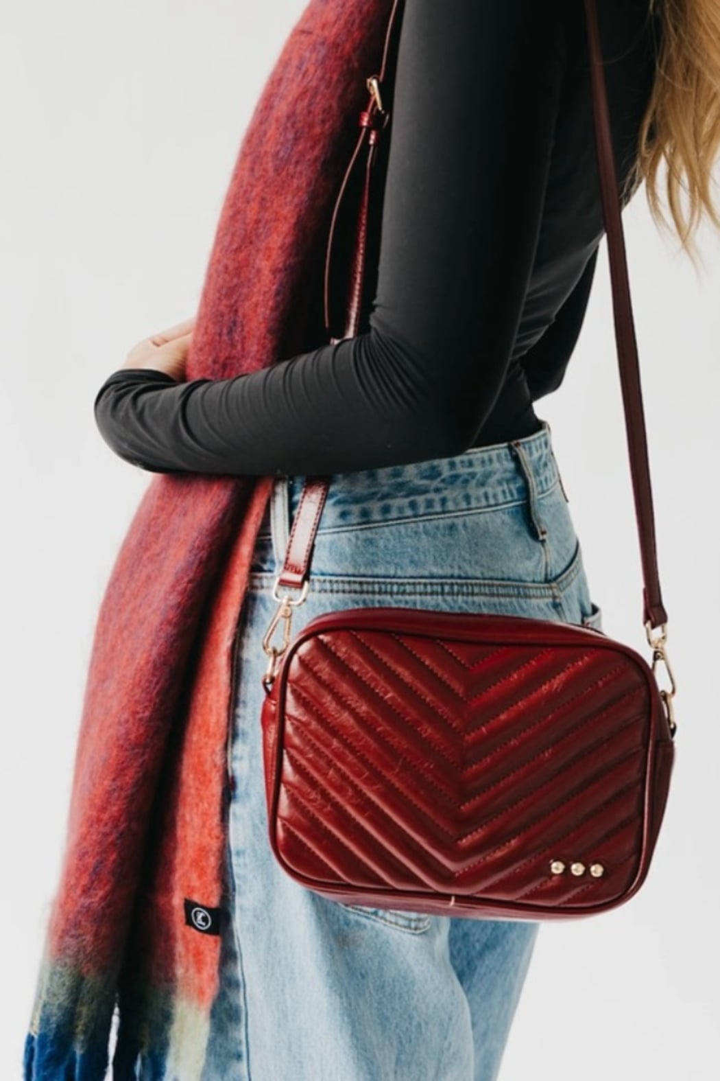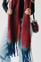 A plush ombré scarf with long fringed ends, perfect for layering on crisp days. The Octavia Ombre Scarf has a soft, slightly fuzzy texture and a gradient of warm red tones fading into blue at the hem. This cozy accessory is the perfect addition to your winter ensemble!
