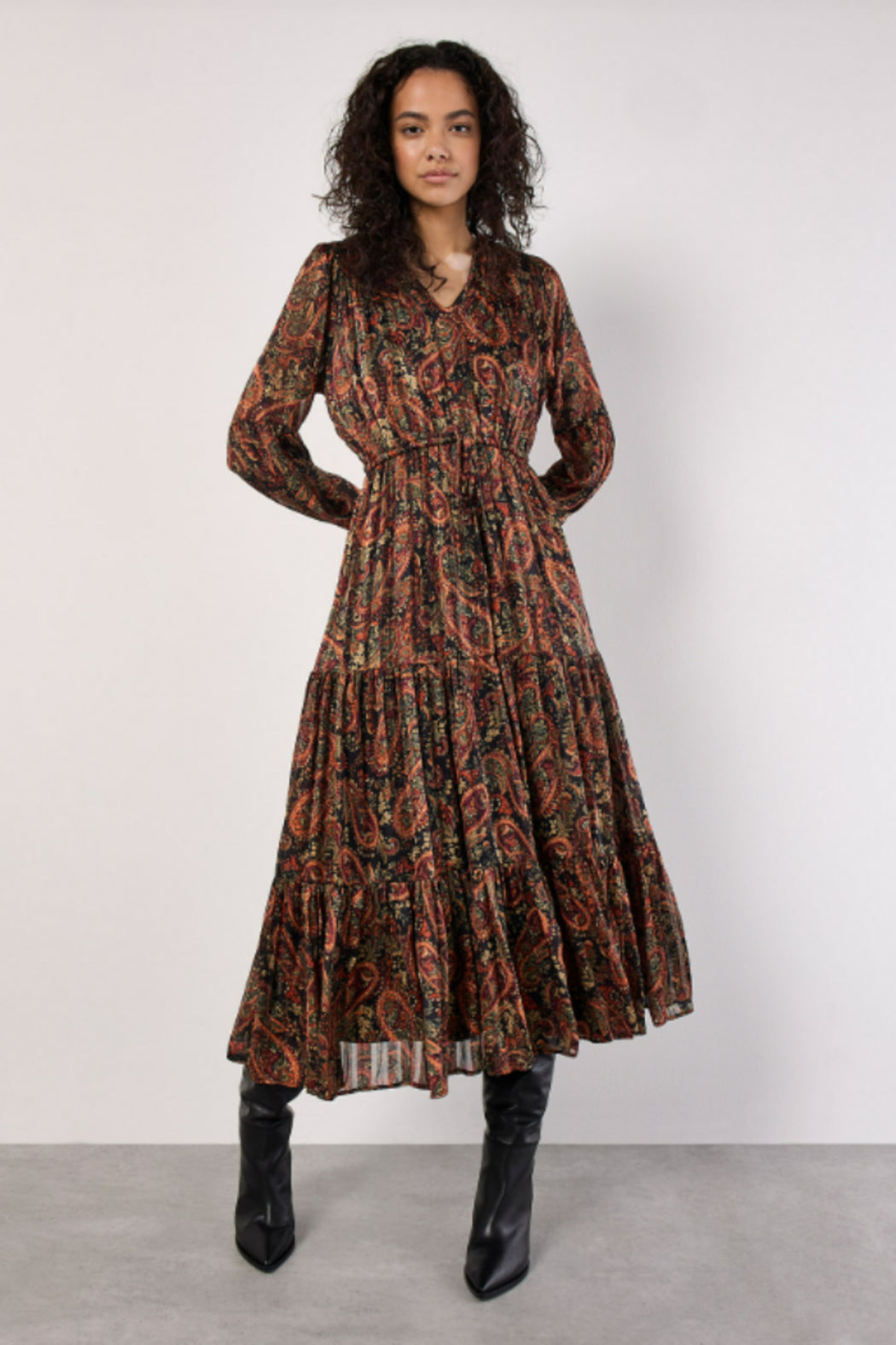 Step into autumn with the Painterly Lurex Paisley Midaxi Dress. This striking piece features a rich, deep paisley print in warm, earthy tones of rust, gold, and deep forest green, giving it a luxurious, vintage feel. The elegant V-neckline and long sleeves make it perfect for cooler weather, while the smocked or elasticated waist offers a flattering, customizable fit. The tiered skirt adds beautiful movement and a sophisticated, full silhouette. Pair it with tall leather boots, as shown, or simple heels for an effortlessly stylish look, day or night.