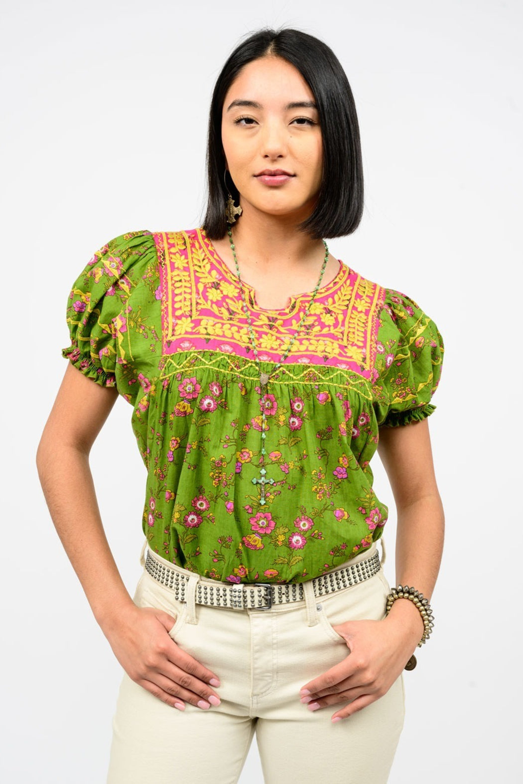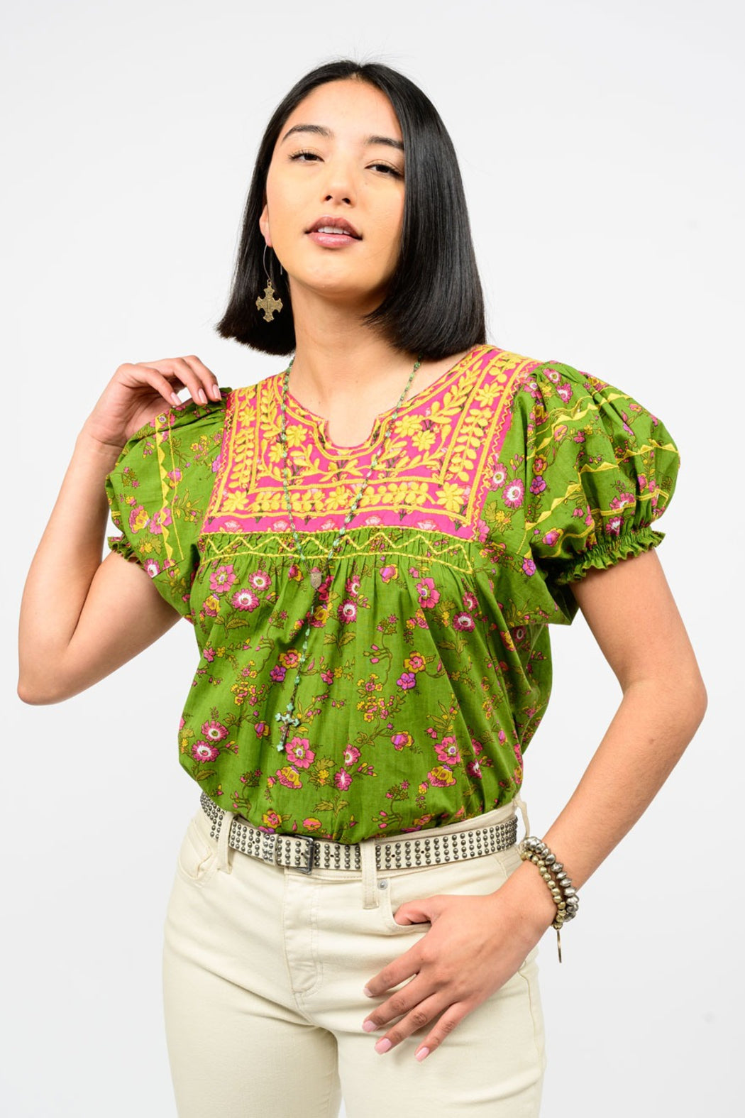 Be the brightest flower in the garden with this breezy embroidered top. The collar features a coordinating colorblock yoke with floral and geometric embroidery. Shirring on the front and back, as well as gathered cap sleeves, give this top a playful flounce. Pair with your favorite jeans or throw on some coordinating shorts to keep the colors going.