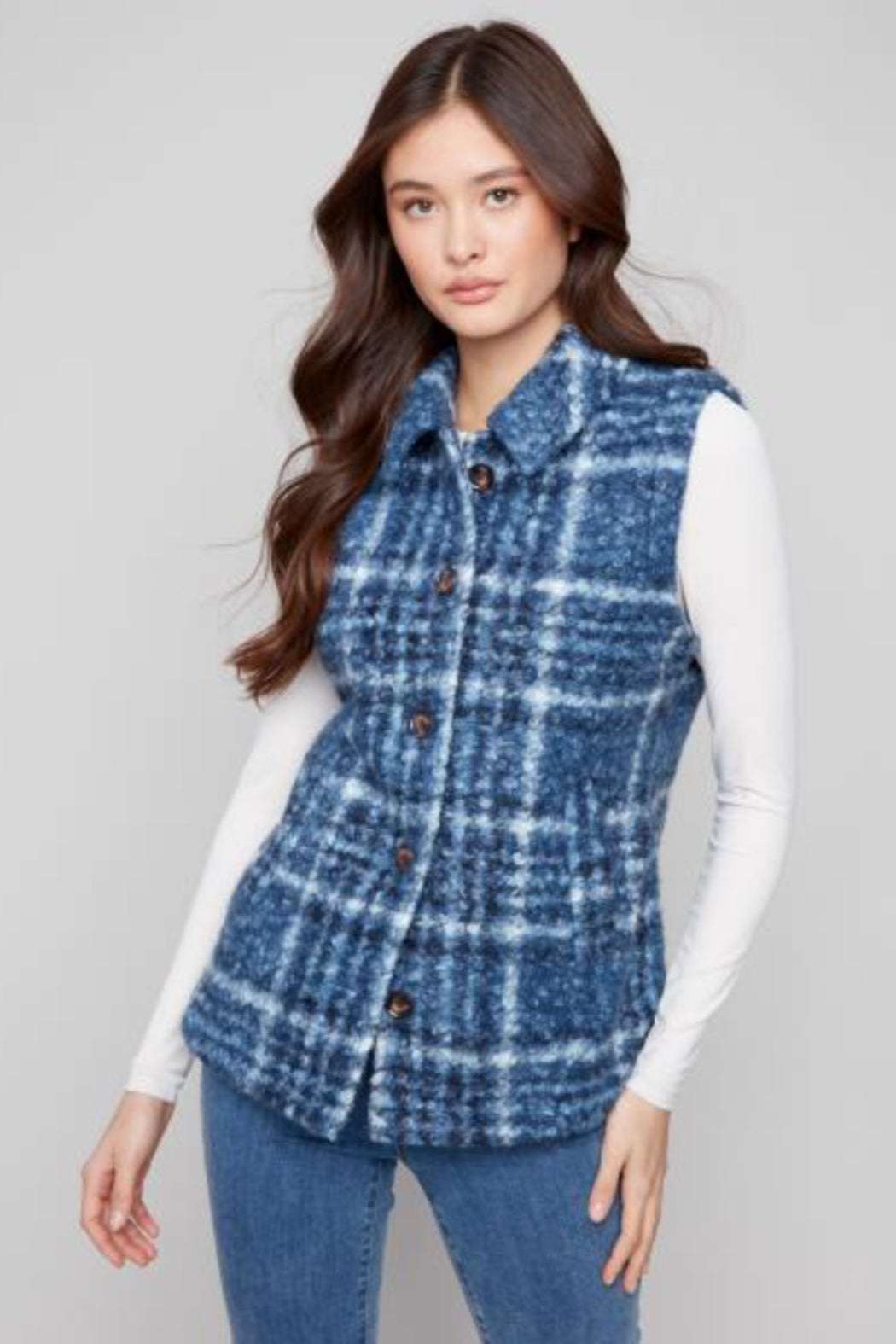 Add a touch of warmth and rustic charm to your wardrobe with Charlie B's Plaid Boucle Knit Vest. Crafted from a soft, textured sherpa fabric in a classic blue and white plaid pattern, this vest is perfect for layering. It features a comfortable collared neckline and a button-down front with coordinating brown buttons.