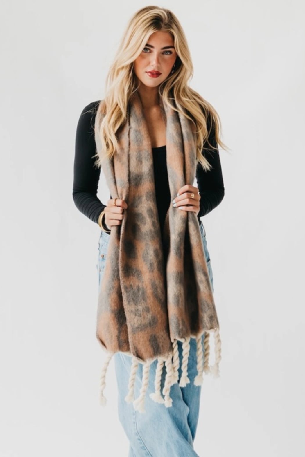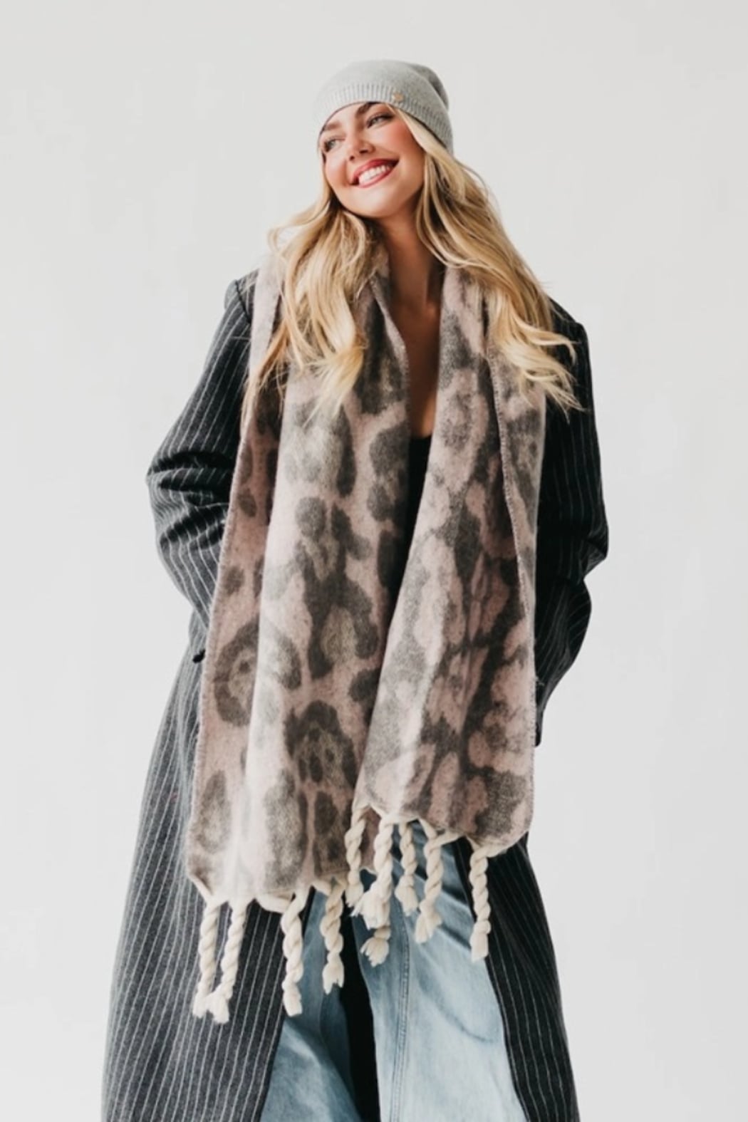 Cozy and eye-catching, the Priscilla Printed Scarf layers a soft leopard print over a plush, brushed fabric for instant warmth. Pretty Simple designed this oversized wrap with twisted fringe ends for a relaxed, dressed-up look. Wear it over a coat or with casual denim to add texture and pattern to cold-weather outfits.