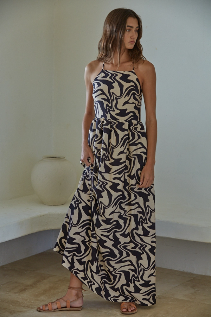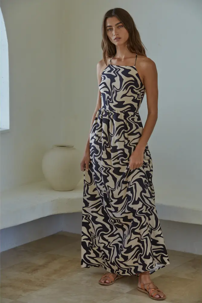 This beautifully draped maxi-dress has a flowy skirt and fun elegant back tie, The RIVERINA MAXI features a flattering square neckline that beautifully frames the décolletage, while the open back design adds a hint of allure. The crossed spaghetti tie straps not only provide a secure fit but also lend a delicate charm to the overall silhouette.