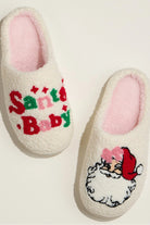 A cozy pair of indoor slippers with a playful holiday motif, named Santa Baby Slippers. Frem presents these slip-on sherpa-style slippers with a plush lining and a soft, rounded mule silhouette that’s ideal for lounging. The tops feature colorful embroidered graphics — one shoe reads “Santa Baby” and the other shows a festive Santa face. Lightweight and comfortable, they’re made for relaxed, off-duty wear around the house.