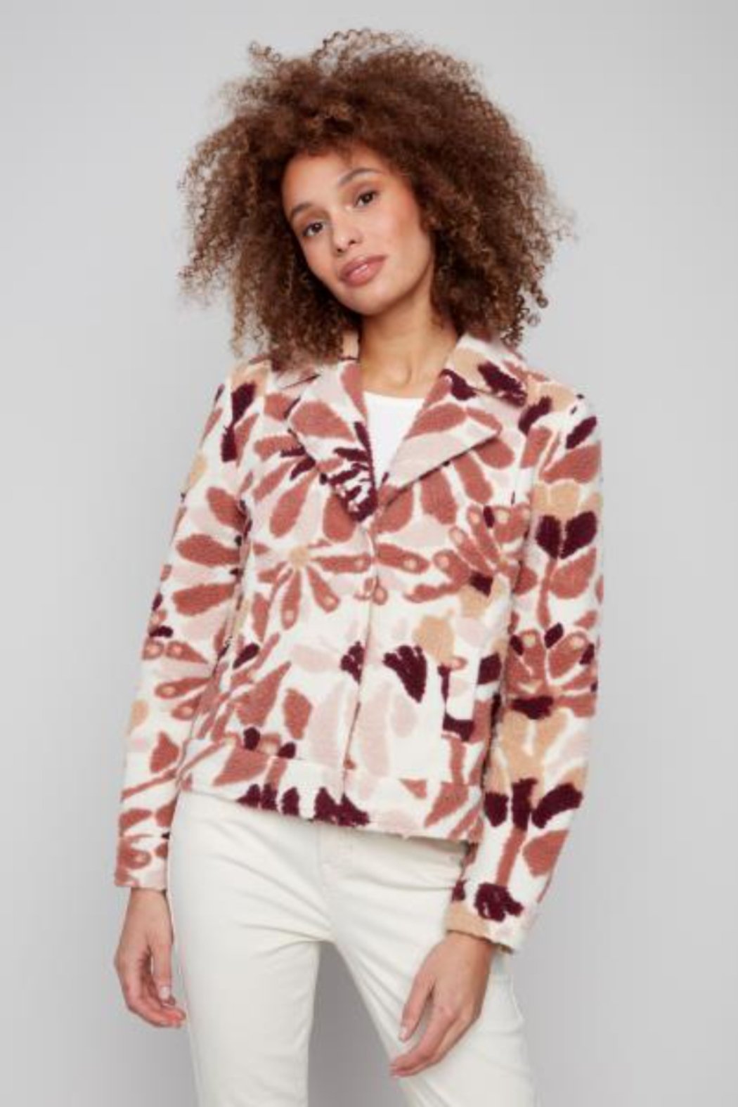 Make a bold statement with Charlie B's Sherpa Flocked Fleece Short Jacket. This unique piece features an eye-catching, abstract floral pattern in a rich, earthy palette of rust, brown, and ivory. The design is created with a special flocked texture, giving the jacket a soft, tactile feel.