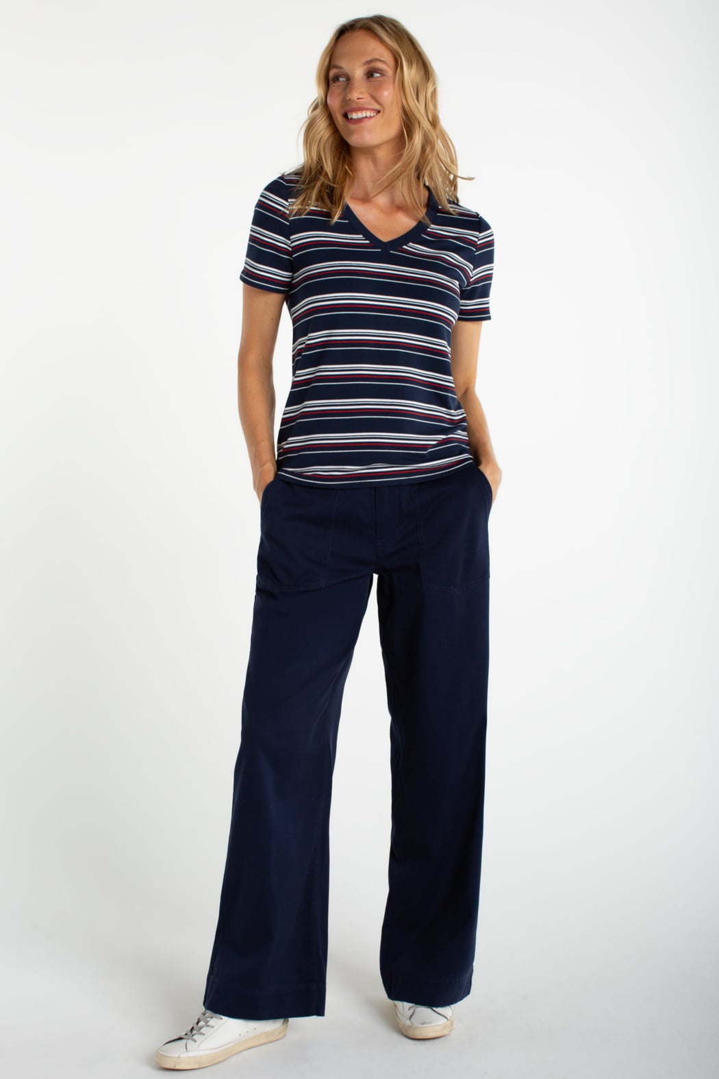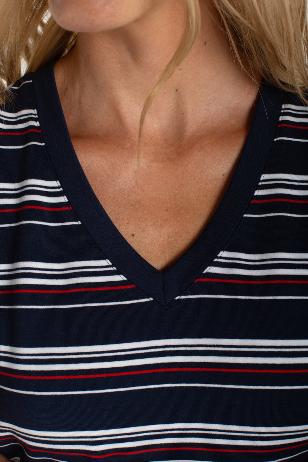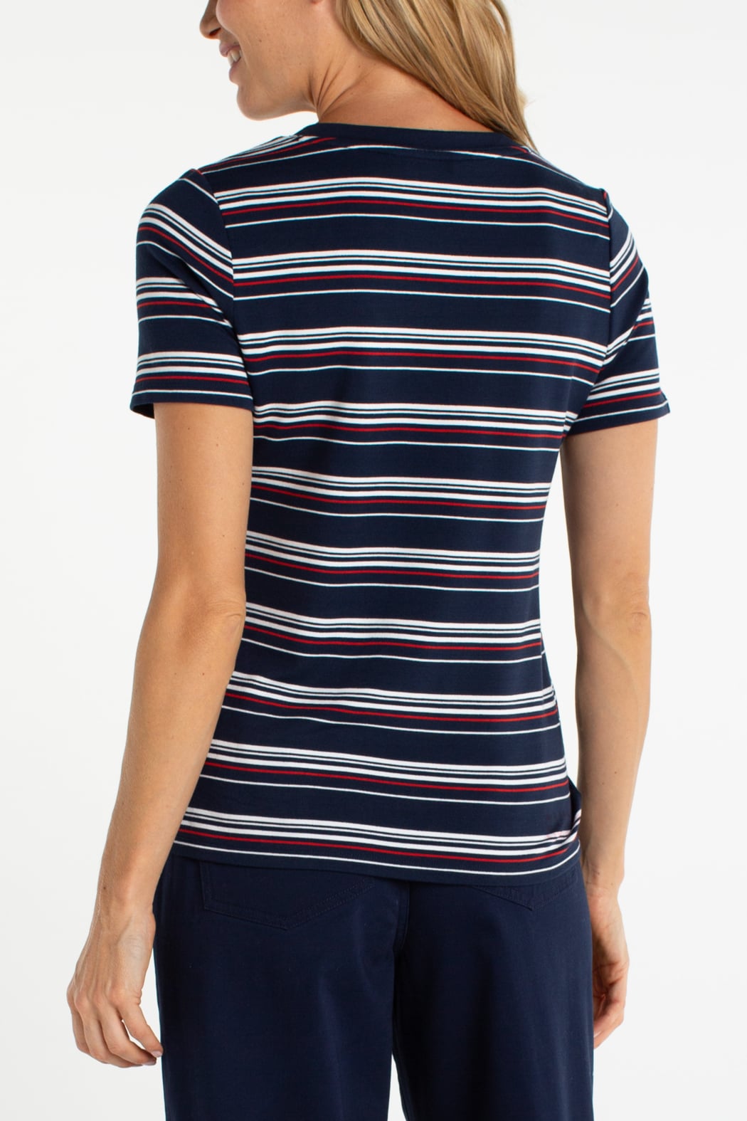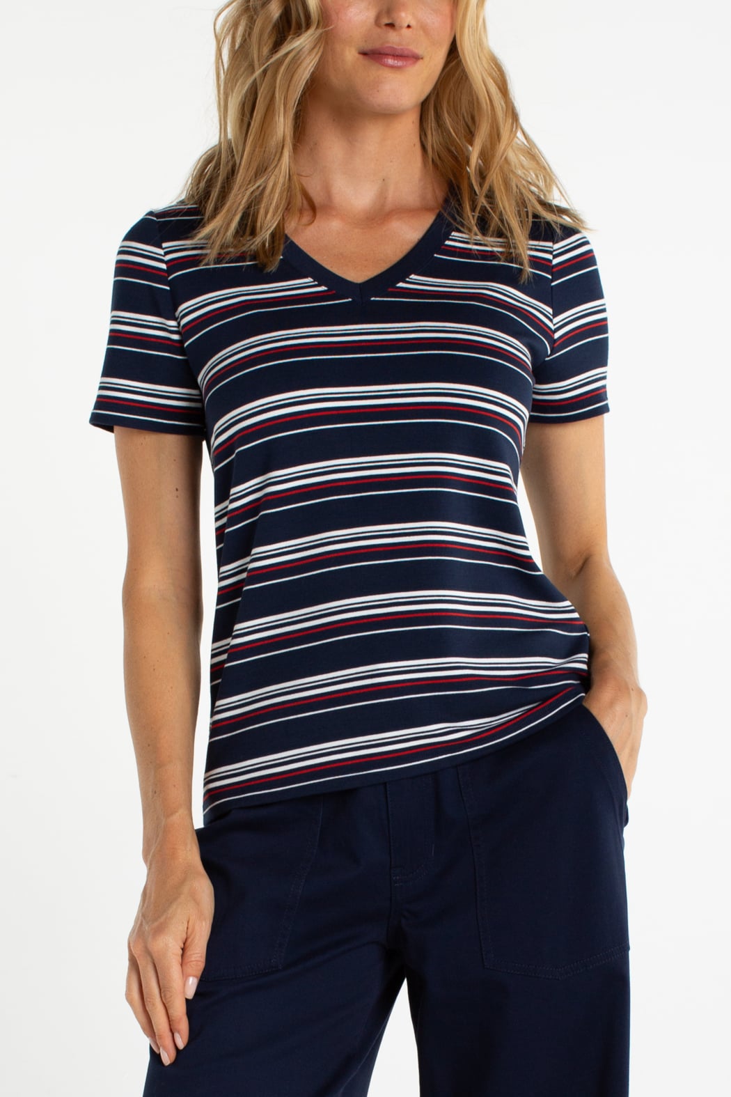 A lightweight striped knit with a clean V-neck and a relaxed tee silhouette, perfect for everyday wear. Featuring narrow horizontal stripes and a soft, stretchy knit that skims the body. Short sleeves and subtle shaping make it easy to layer or wear alone for a casual look. Comfortable and versatile, it transitions effortlessly from errands to weekend outings.