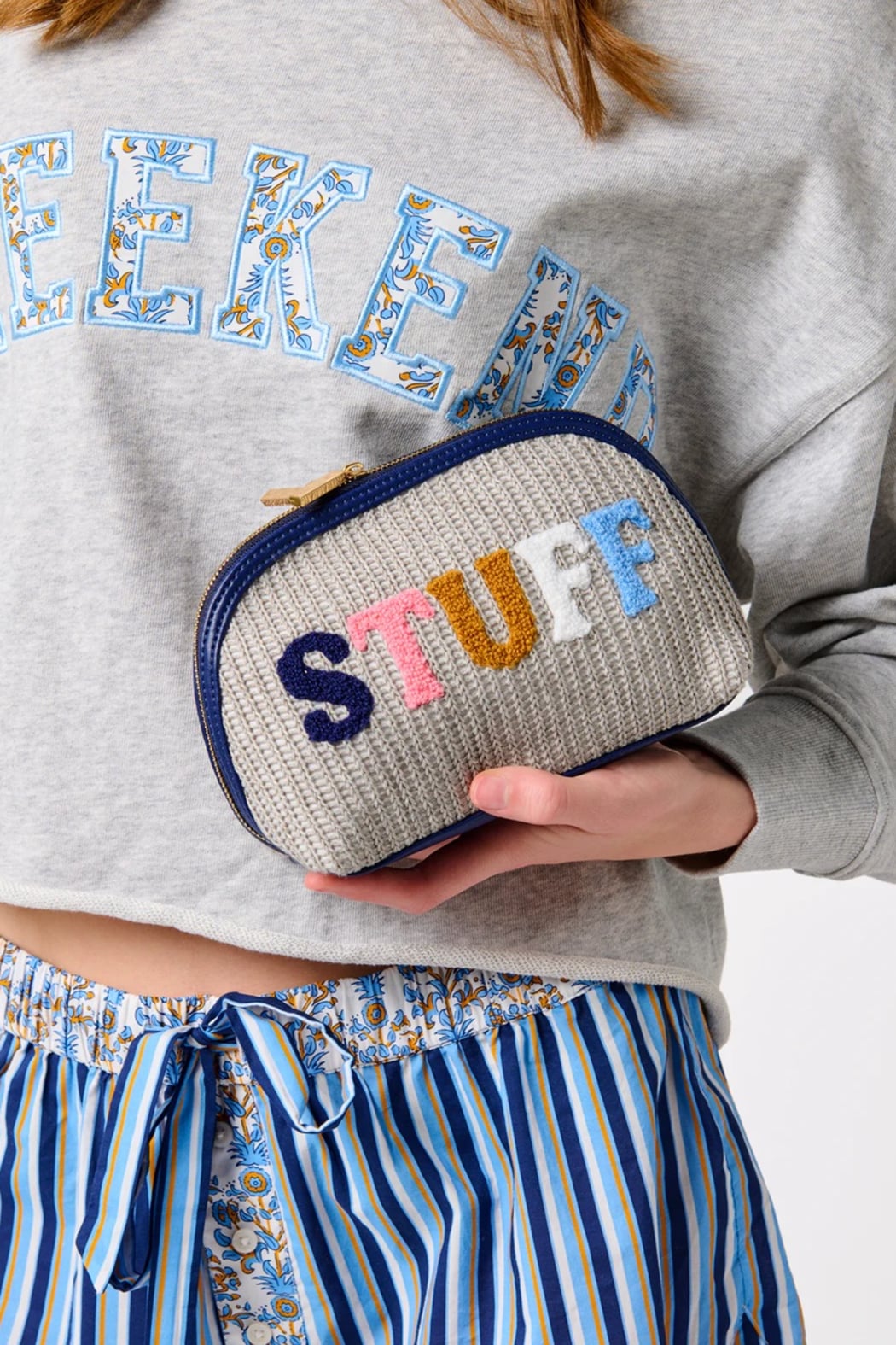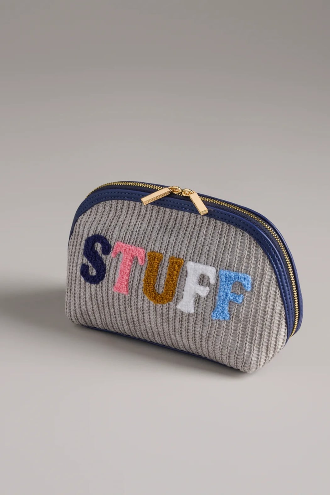 Keep all your little essentials zipped up in style with our “Stuff” Knit Zip Pouch. This soft and flexible pouch features a textured knit exterior, with playful multicolored “Stuff” appliqué lettering, and contrast trim that adds a bold pop. It’s perfectly sized to stash your beauty faves, tech cords, or travel must-haves. Whether it lives on your vanity or tags along in your tote, this pouch keeps your stuff sorted and stylish.