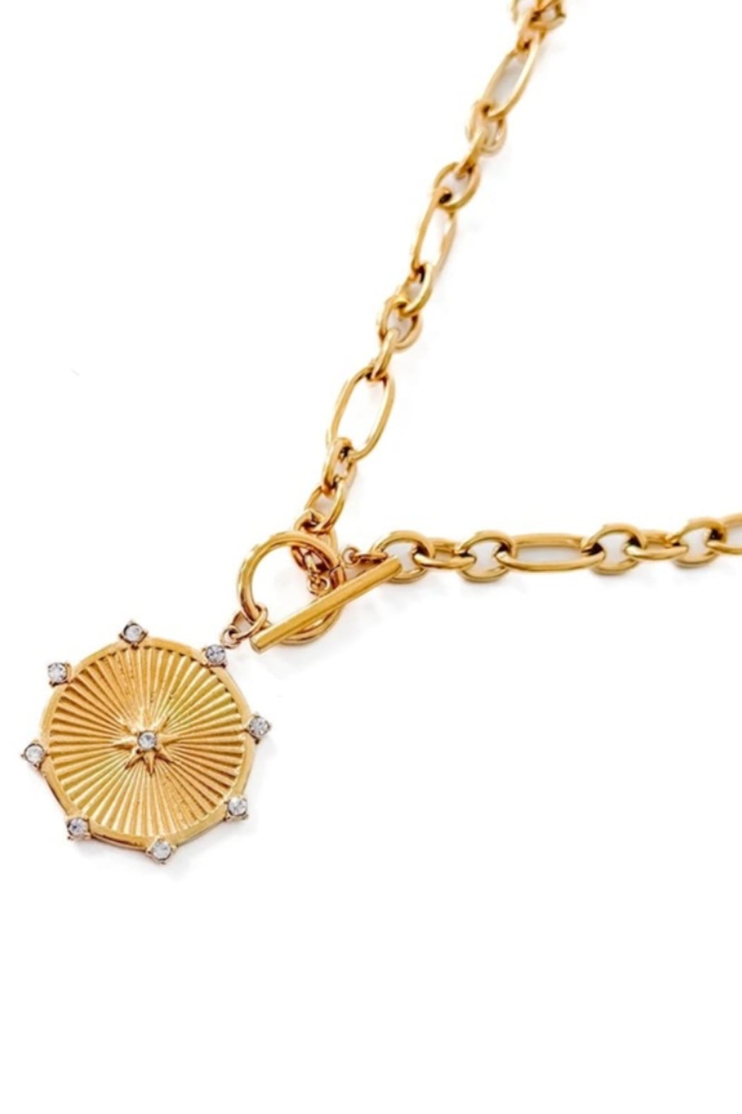 Meet your new favorite waterproof accessory - the Sunburst Chain Necklace! This necklace features a thick chain, a toggle clasp, and a beautiful sunburst pendant with white gems on it. This accessory will elevate all your favorite looks!