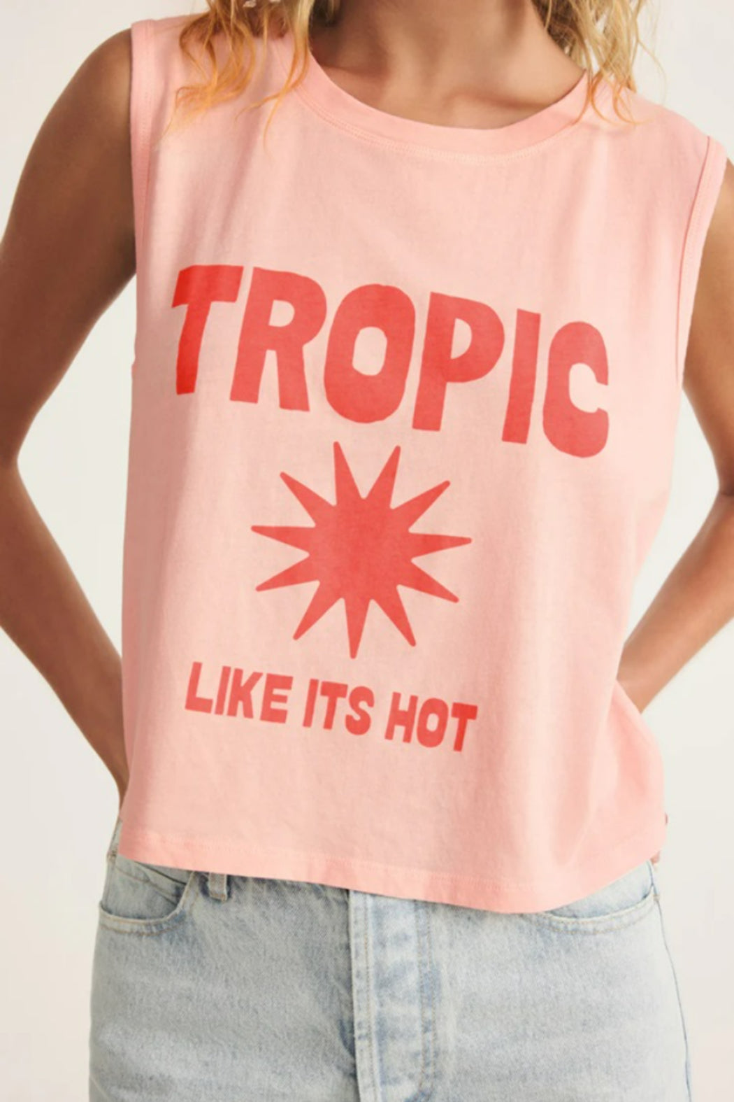 This breezy muscle tank brings laid-back vibes and everyday comfort in soft cotton jersey. Featuring a "Tropic Like It’s Hot" screen print with a sun graphic, it’s the perfect pick for sunshine-filled days.