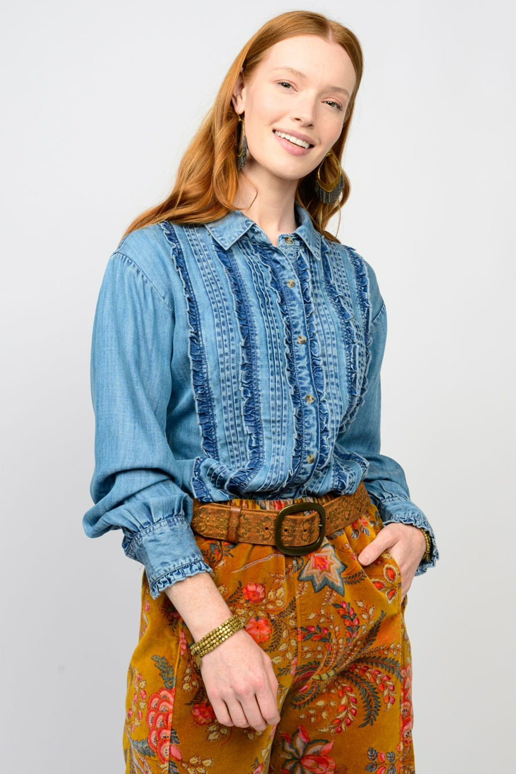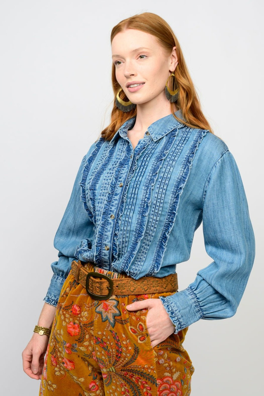 Embrace effortless charm with this beautifully detailed chambray blouse. Crafted from a soft, light-wash denim-like fabric, this top features a striking ruffled bib design on the front, adding a touch of sophisticated texture. The button-front closure is subtly elegant, while the full, voluminous sleeves gather delicately at the cuffs, creating a comfortable yet refined silhouette.