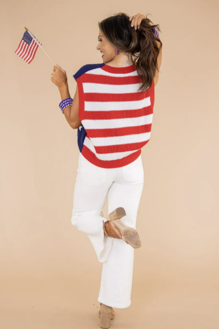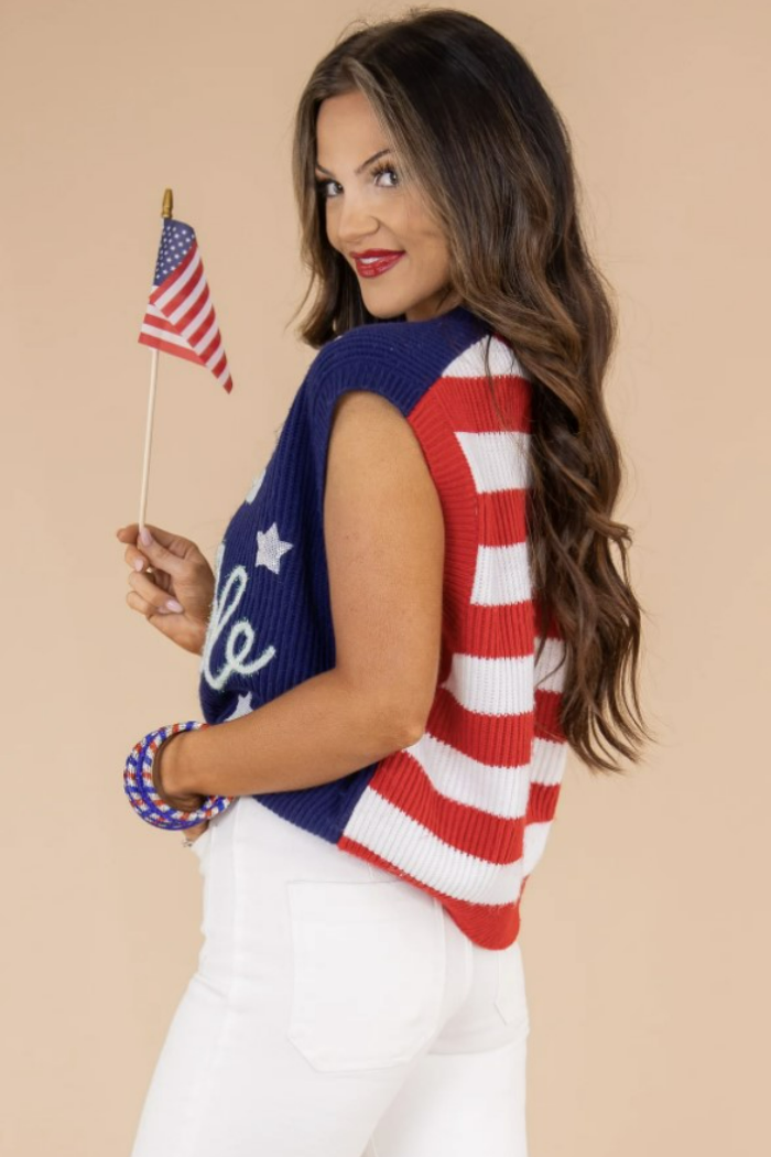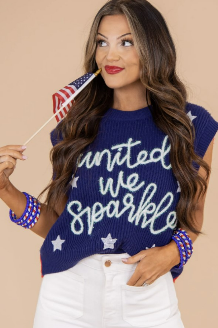 This United We Sparkle Sweater Vest is the perfect way to show off your patriotism! With a unique flag striped back and sleeveless silhouette, this stylish vest has a rounded neckline and is perfect for any occasion. Be the Queen of Sparkles in this amazing vest.