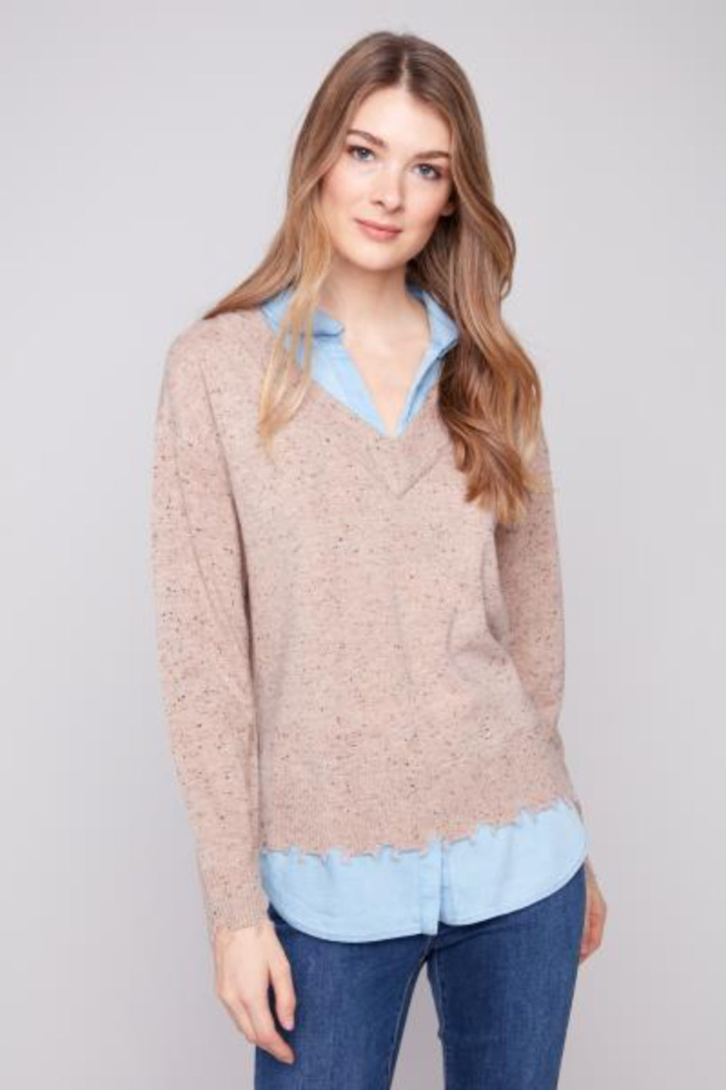 Add a touch of effortless charm to your wardrobe with this beige speckled V-neck sweater built in chambray blouse underneath. Designed with a relaxed fit, it features a soft knit finish and a layered hem detail with a light blue shirt trim for a modern, pre-styled look. The subtle speckled pattern adds texture and depth, making it a versatile piece you can wear from work to weekend with ease. Pair it with jeans for a casual vibe or dress it up with tailored pants.