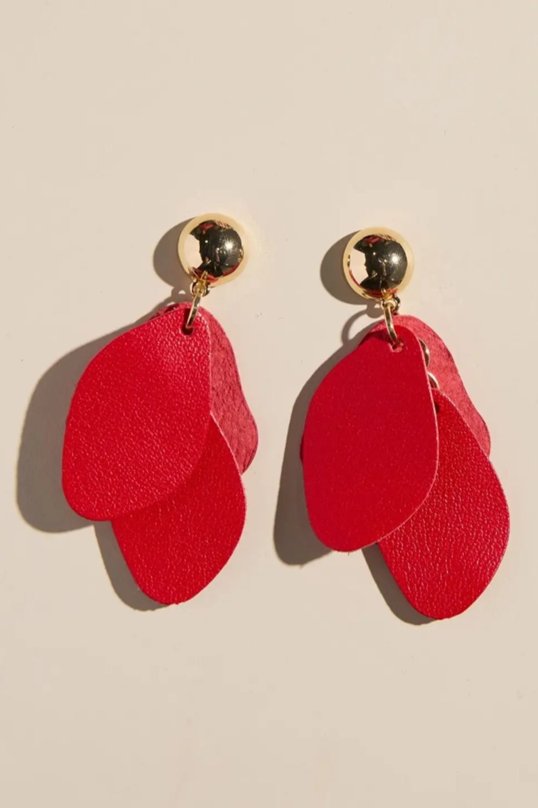A new take on leather earrings, introducing the Weston. Crafted with lightweight pomegranate Nappa leather and a gold stud piece, these statement stud earrings embrace a free-flowing vibe with a pop of modern charm.