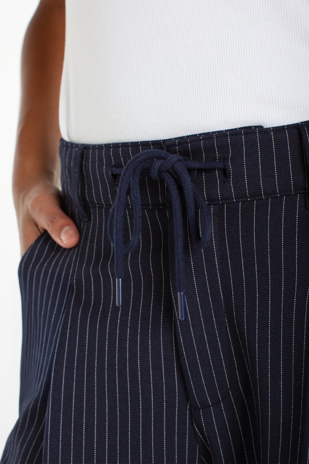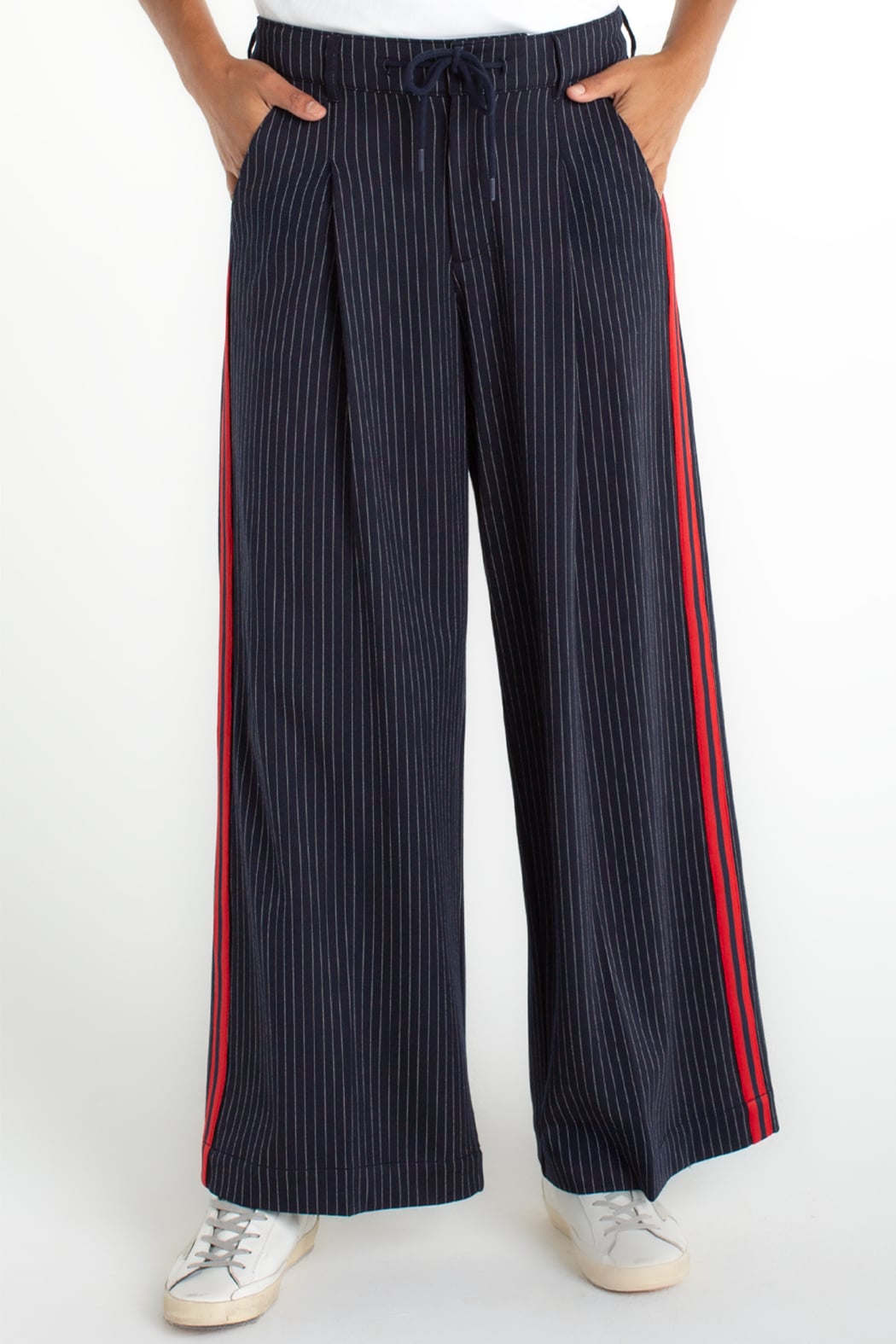 A polished wide-leg trouser with pleated detailing and a refined pinstripe finish, updated with sporty red side stripes for a modern edge. The Wide Leg Striped Pleated Trouser pairs tailored shape with a drawstring waist for an adjustable fit. Easy to style for a sporty streetwear outfit or dress up for the office.