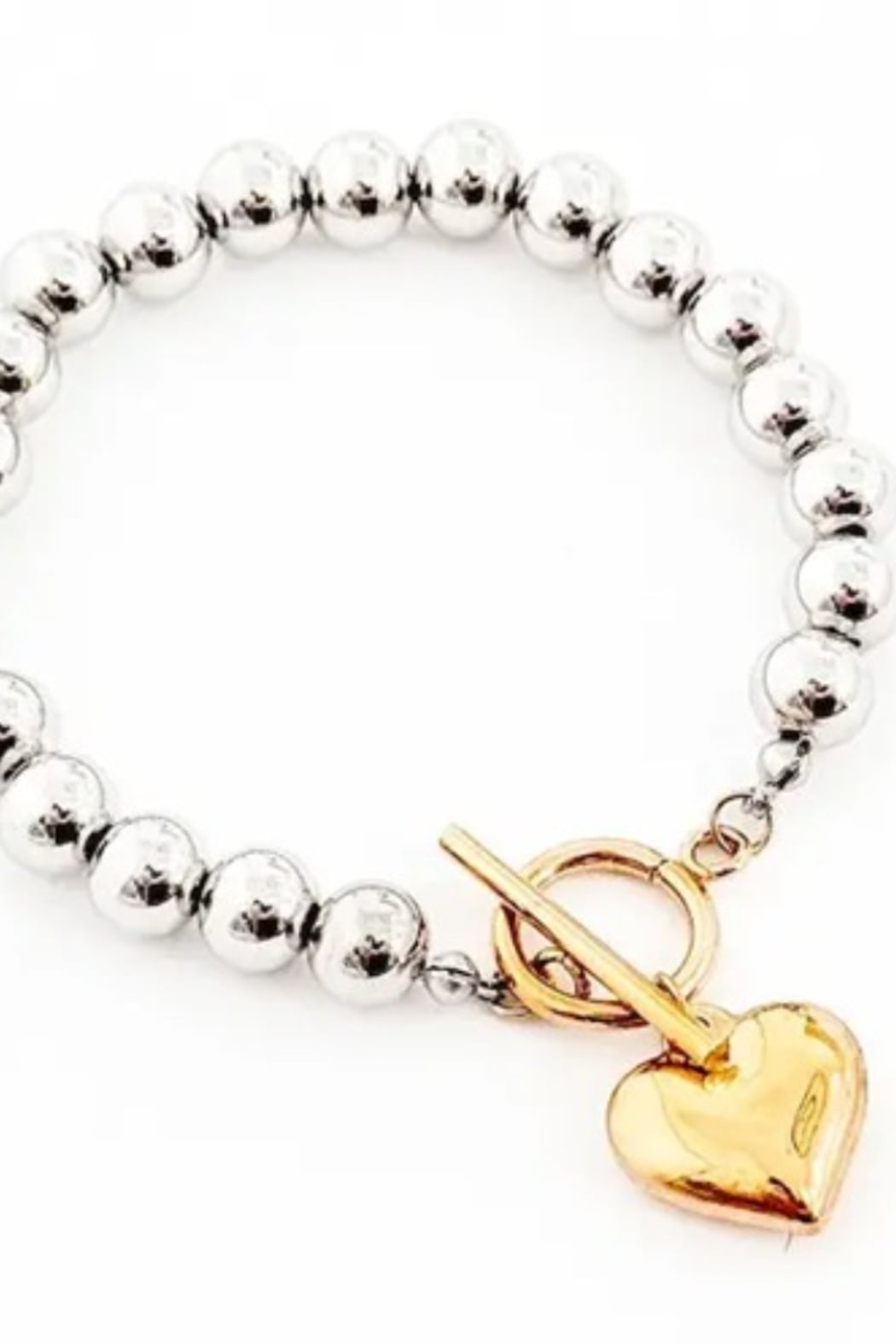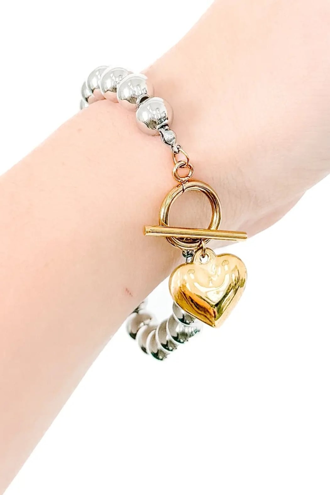 Fall in love with this chunky, eye-catching Wrapped in Love Toggle Bracelet. The heart-shaped charm toggle clasp adds a touch of whimsy to the bold gold and silver waterproof statement bracelet. A very versatile piece for any time of the year!
