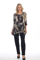 2 pocket swing tunic pairs perfectly with a straight leg black pant or denim! Wrinkle resistant and travel friendly. Perfect for so many occasions! Gorgeous blacks, grays, gold-taupe, and white are used in this brush stroke print design.