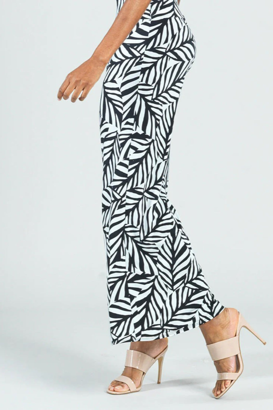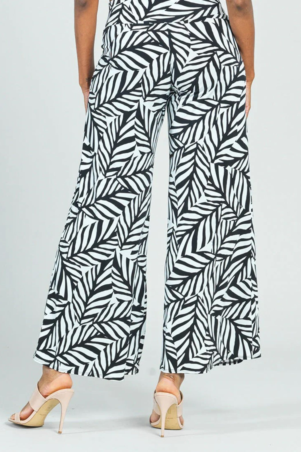 Featuring a 3” pull-on soft waistband and ultra-flattering wide-leg silhouette that naturally flows against the body. A large-scale leaf print in a stripe-like cluster, comprised of white and black shades. Each piece is a unique, one-of-a-kind print and print placement will vary.