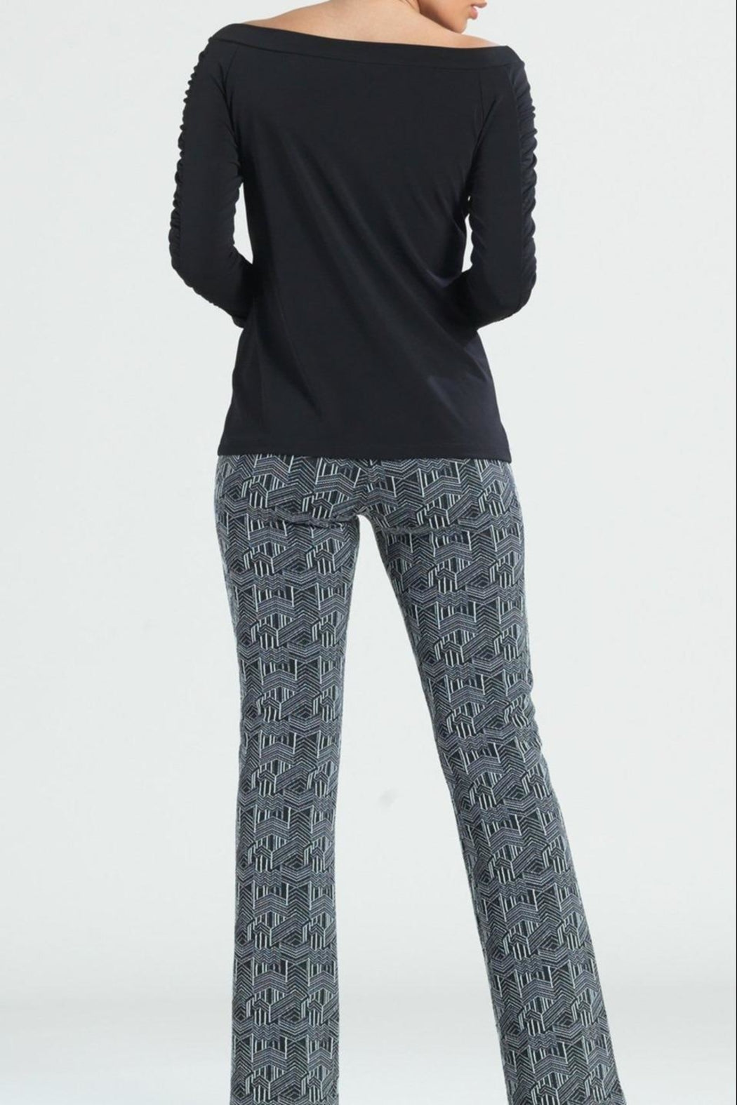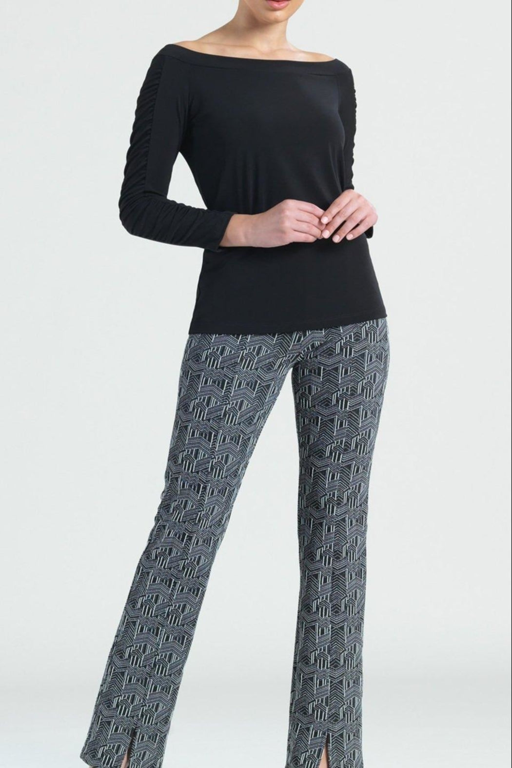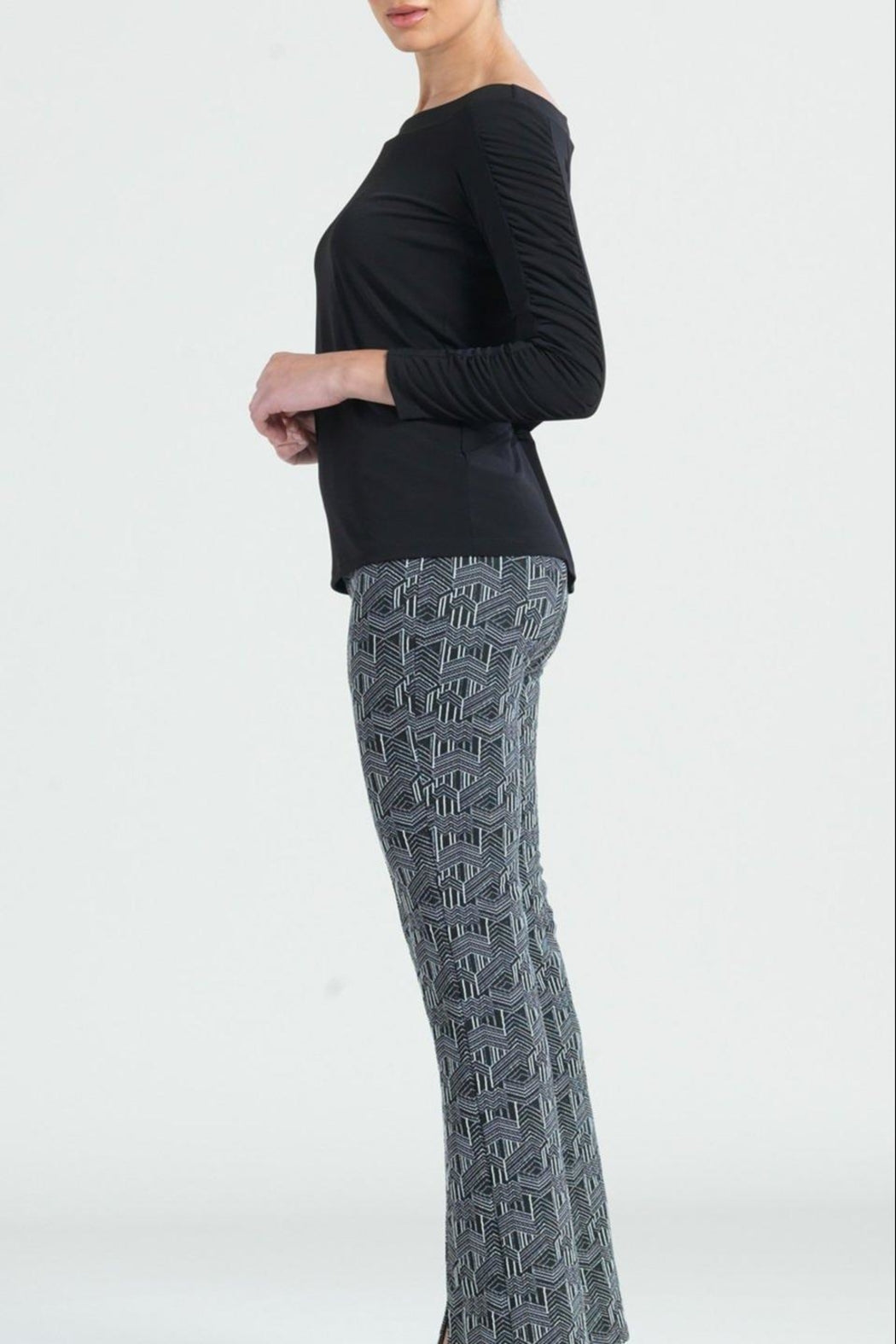 Off the Shoulder Stretch, Soft Knit Top in black. Feminine bateau neckline with 3/4 length sleeves. Trendy ruched detail and straight waist hem. An easy pairing with many pant or skirt options. Fit runs true to size, but if you are a size D cup + you may choose to size up. Wrinkle resistant and travel friendly.