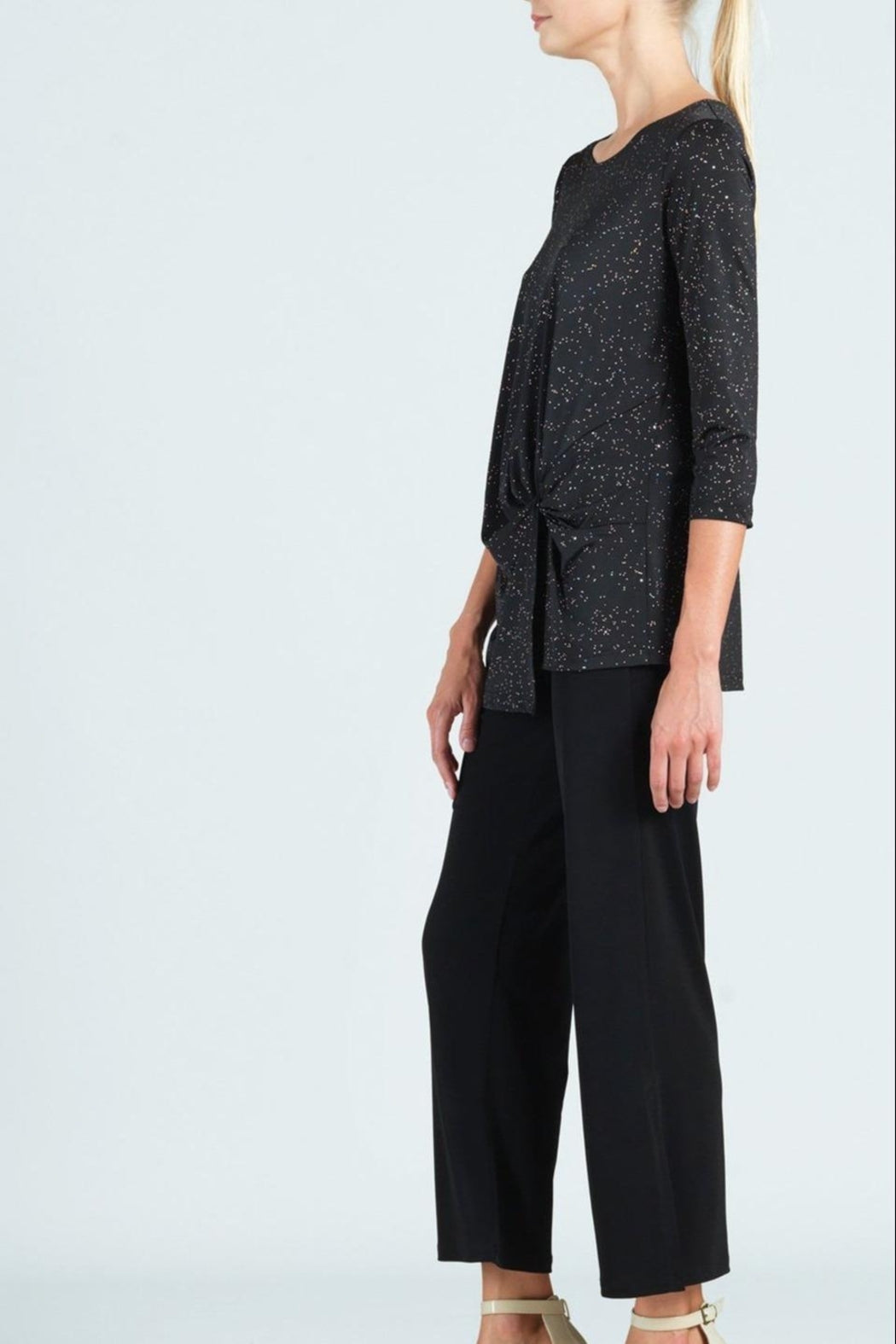 How perfect would this starry night stretch tunic be for all of your holiday parties? The sparkle is perfect in it as it is subtle enough to wear all year round instead of just for parties. This is also nice since this fabric is travel friendly if you have to travel for the holidays. The tie in the front is very flattering as well.