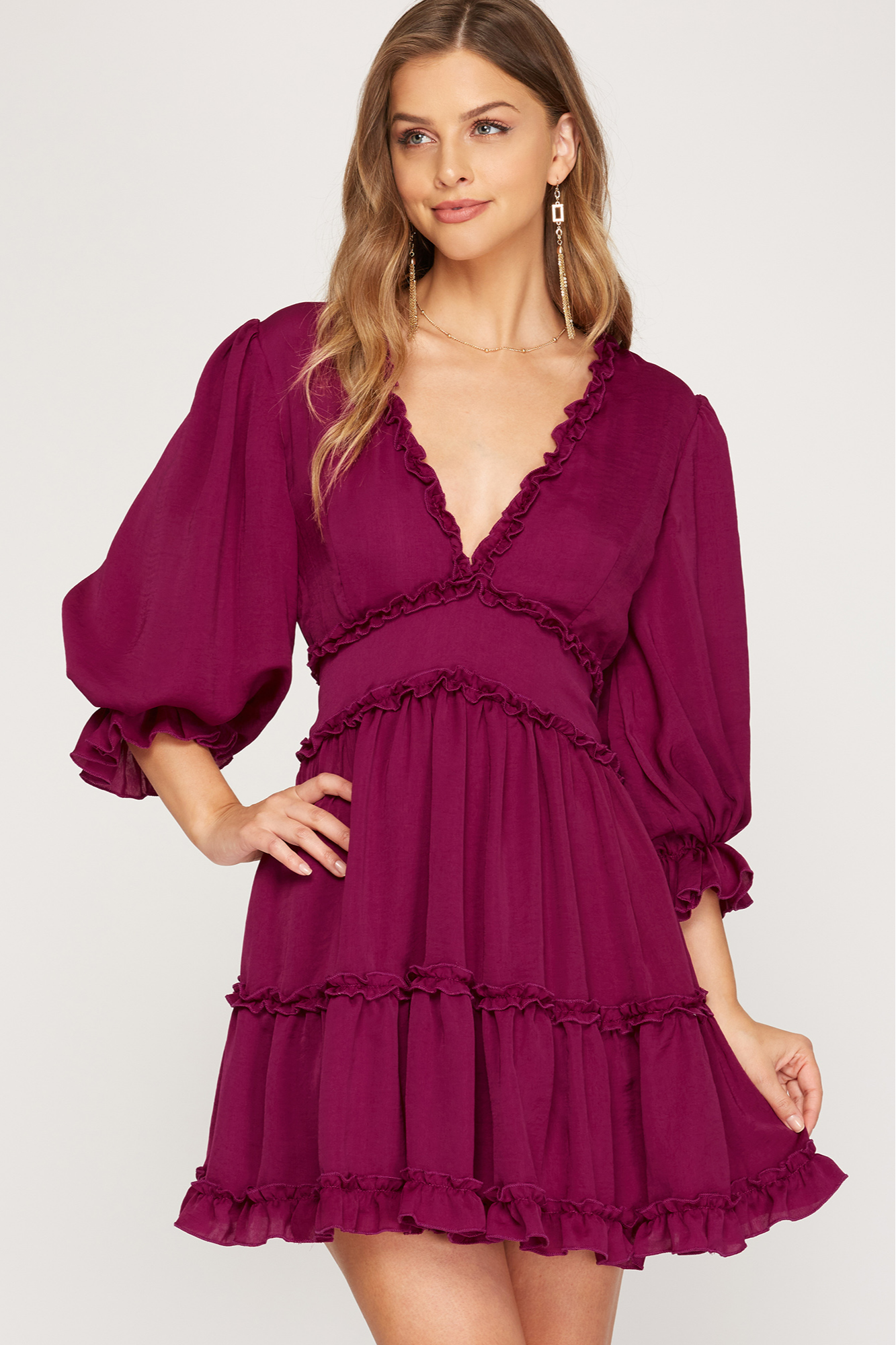 3/4 sleeve woven satin tiered dress with ruffle details. Model is 5'8 wearing a size small.